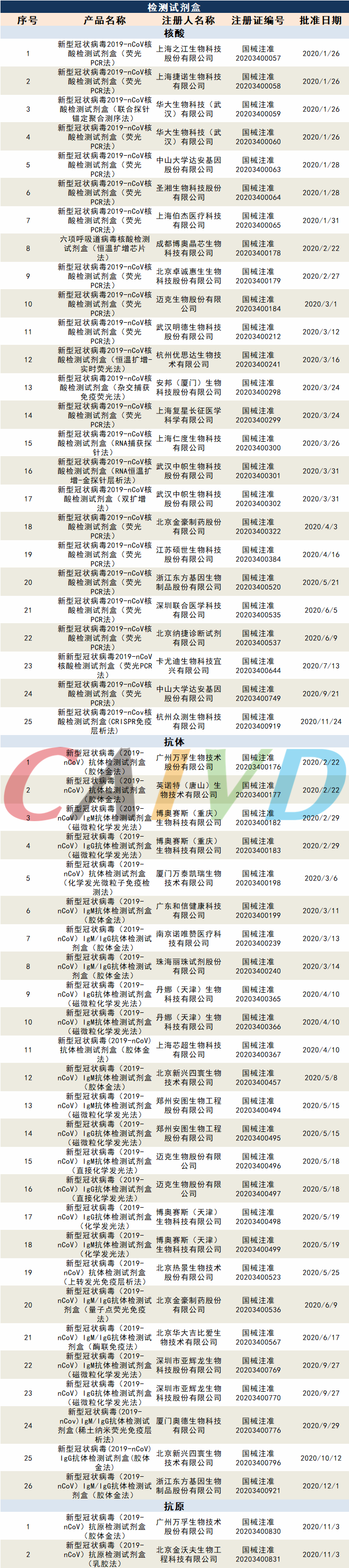 12月1日,国家药监局批准了浙江东方基因生物制品股份有限公司的新冠抗体检测试剂盒。截至目前,国内新冠核酸、抗体、抗原检测试剂获证企业达40家,产品达53个!