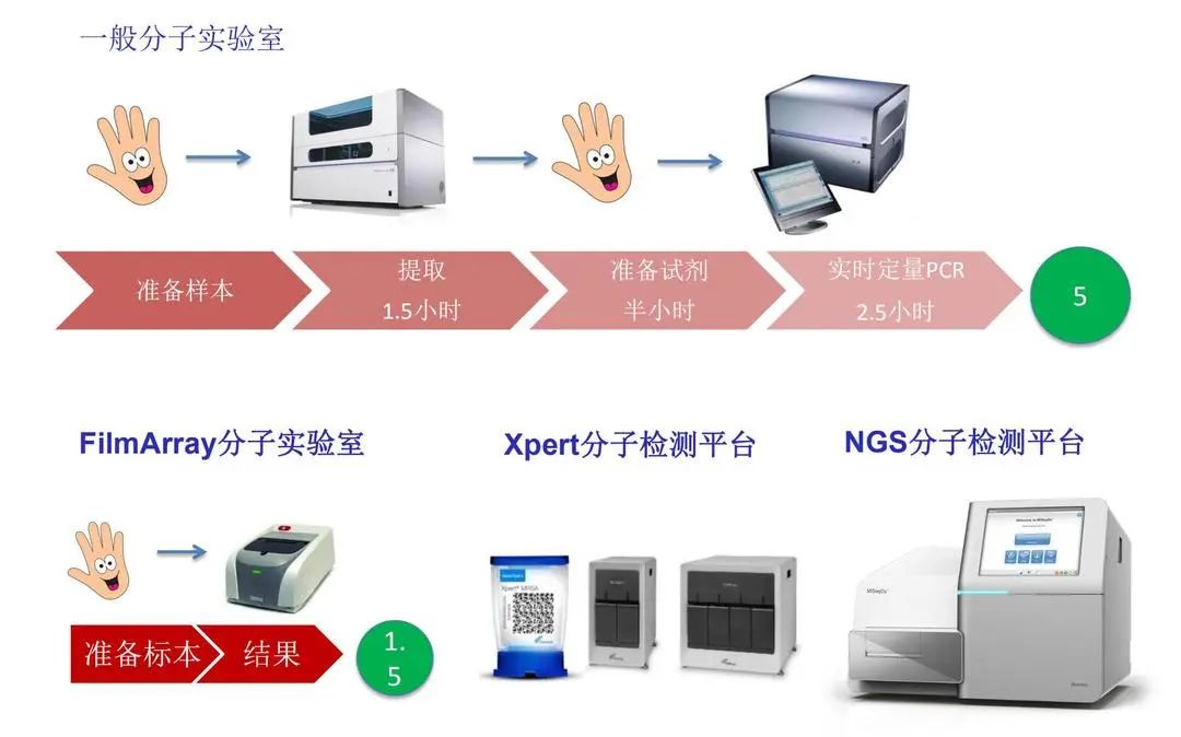分子生物学的临床应用,非常需要的是快速多重分子生物学的检测方法,实现「样本进报告出」的检测模式,这方面国际做的比较好的包括FilmArray、Xpert等平台。疫情期间,我们也看到一些国产的POCT分子生物学快速检测平台,已经慢慢应用到临床工作中,特别是新冠检测的领域。此外,包括用于二代测序的平台都已被广大医务人员所熟知。