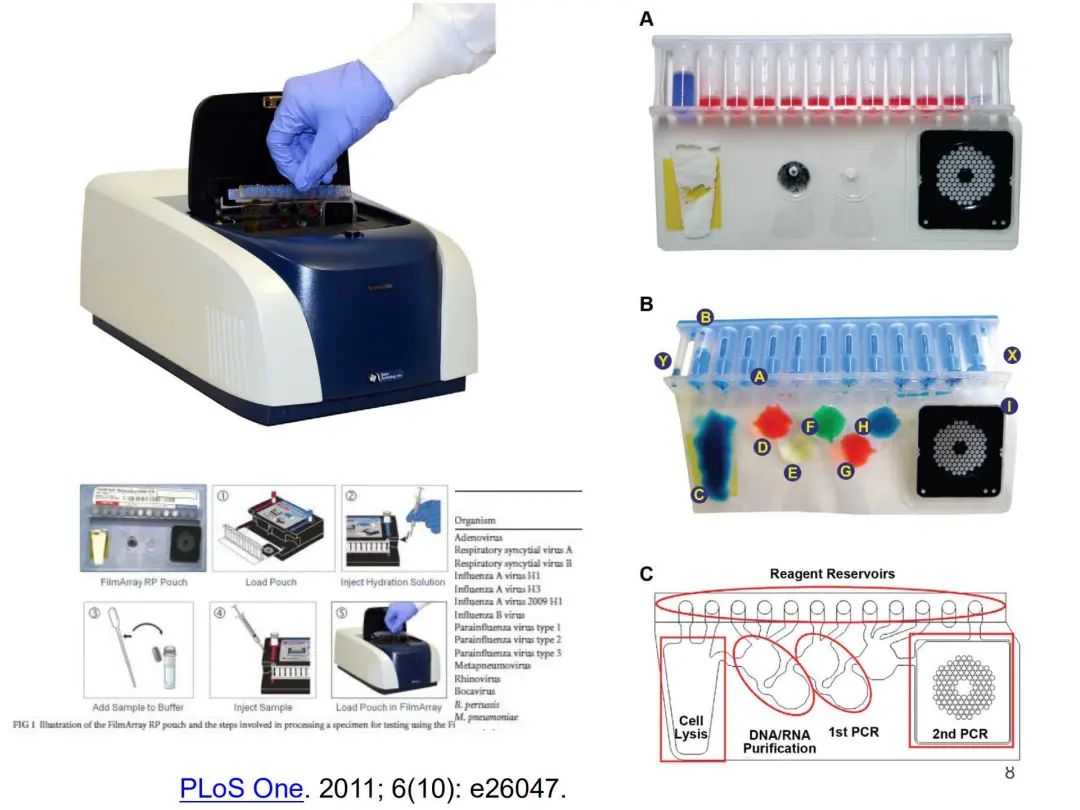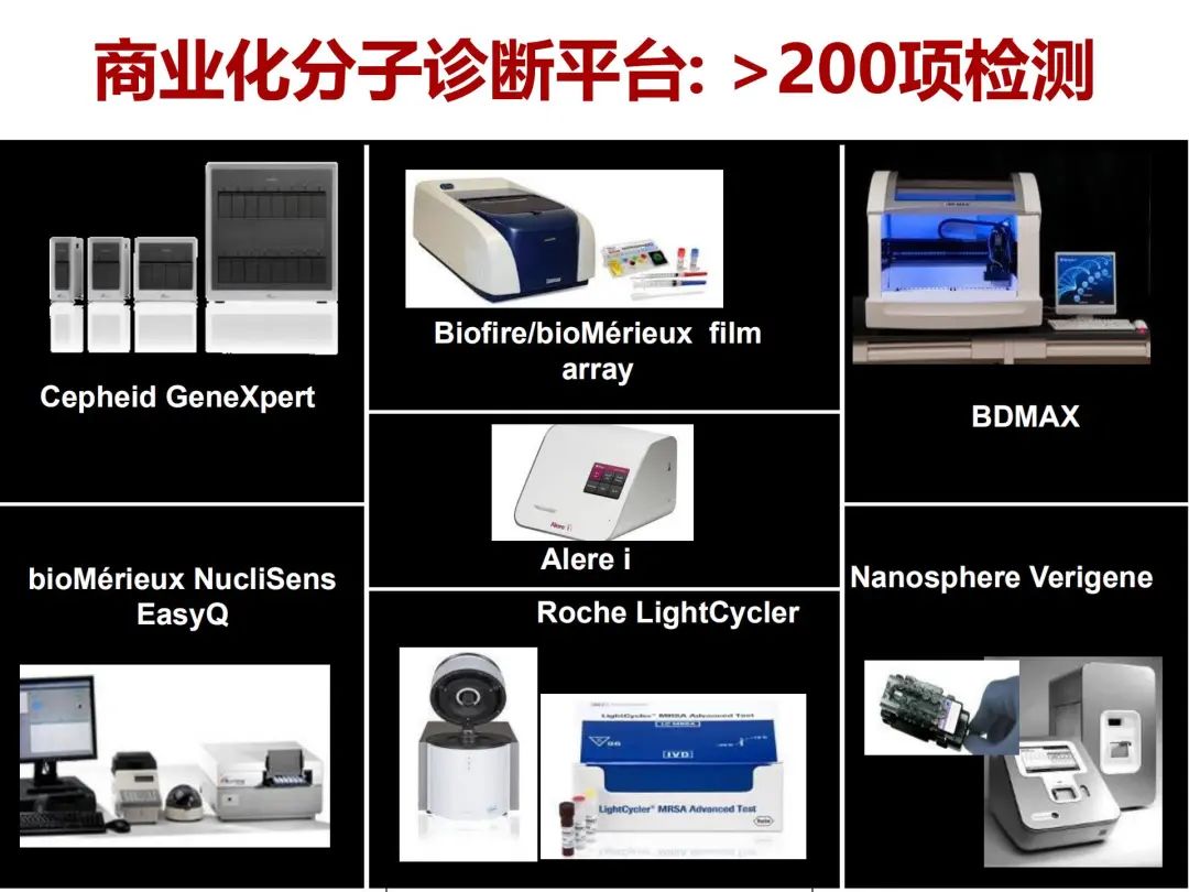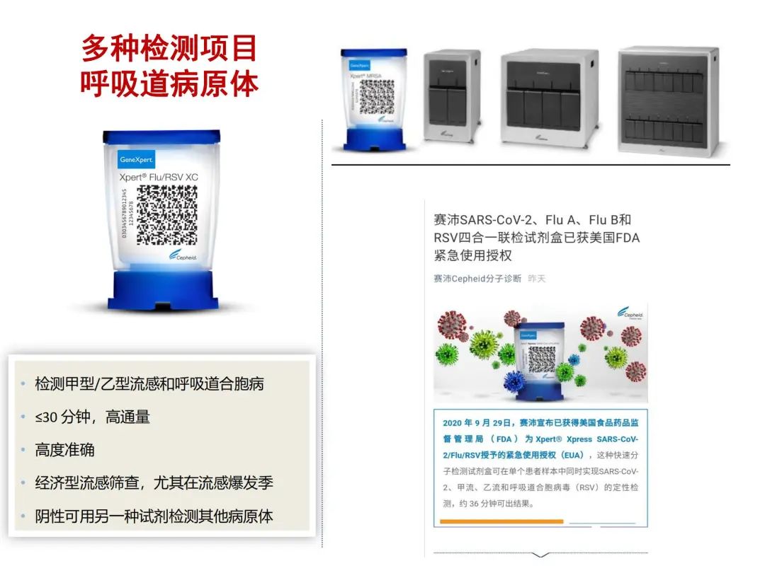 上图所展示的是目前分子生物学检测的手段,虽然没有列出国内的,但最近几年国内快检的分子检测手段也应用得越来越多。 进口的Xpert平台,在国内主要用于结核分枝杆菌,以及利福平耐药的检测,但实际上在一些病毒检测中它也有独到之处,如该平台有甲、乙流和呼吸道合胞病毒的联合检测手段。COVID-19期间他们也研发出的SARS-CoV-2检测手段,只是目前在国内还没有上市。但这样的手段对临床高度怀疑的患者提供了非常必要的快检方法,可以在30分钟内完成检测。