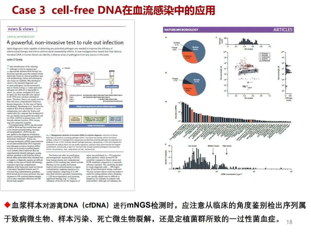当患者为血流感染时,目前常血浆进行基因组检测时,检测的主要是游离DNA(cell-free DNA,cfDNA),在人体其它部位感染或者定植的微生物,有一部分可以将降解的cf DNA释放入血。所以,我们在解读血液样本的mNGS结果时一定要注意,里面有可能是一些比如口腔链球菌、唾液链球菌等,如果是这些存在,并不意味它一定是病原体,可能只是一些裂解的核酸,需要与临床结合,不能将检测核酸与感染的病原微生物划等号,这是非常关键的。