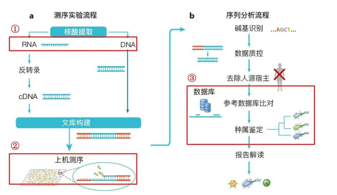 不同厂家之间的mNGS结果差异性非常大的原因是什么?上图为目前mNGS的流程。mNGS有些关键的环节非常重要,首先是核酸的提取,但在之前采集一份合格的样本更重要。必须要注意,不管检测手段多么先进,检测只能告诉我们样本中某种病原存在的情况,如果采集的样本里不含有相关病原,即使技术再高也只能得到「南辕北辙」的结果。因此,我们首先强调的一定是采集合格的样本,只有合适的反映感染部位感染情况的样本才能进入核酸提取的过程。如果只考虑DNA病原感染,仅做DNA测序即可。如不能排除RNA病毒,或者想在转录水平上看微生物的情况,需要有反转录的过程将RNA转化成cDNA。然后进行文库构建,二代测序通常要将上一步提取的基因组打断成比较均一的50~150bp的长度,开始测序。