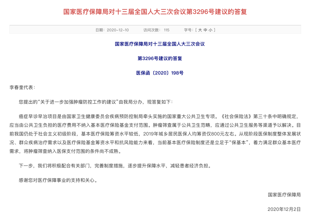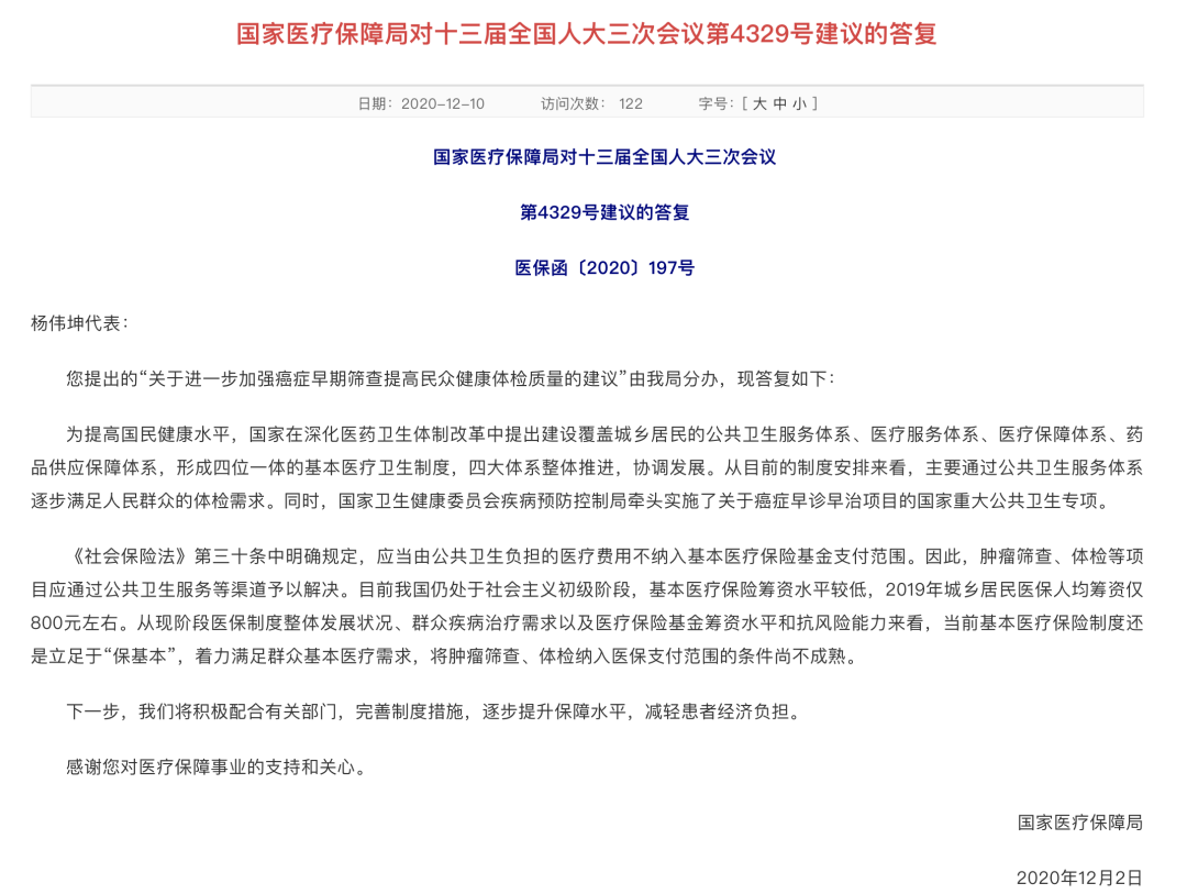 12月10日消息,国家医保局对十三届全国人大三次会议第3296号建议、4329号建议作出答复,答复明确:“将肿瘤筛查、体检纳入医保支付范围的条件尚不成熟”。 近年来,我国正在深化医药卫生体制改革,提出建设覆盖城乡居民的公共卫生服务体系、医疗服务体系、医疗保障体系、药品供应保障体系,形成四位一体的基本医疗卫生制度。从目前的制度安排来看,主要通过公共卫生服务体系逐步满足人民群众的体检需求。同时,国家卫生健康委员会疾病预防控制局牵头实施了关于癌症早诊早治项目的国家重大公共卫生专项。《社会保险法》第三十条中明确规定,应当由公共卫生负担的医疗费用不纳入基本医疗保险基金支付范围。因此,肿瘤筛查、体检等项目应通过公共卫生服务等渠道予以解决。目前,我国基本医疗保险筹资水平较低,2019年城乡居民医保人均筹资仅800元左右。从现阶段医保制度整体发展状况、群众疾病治疗需求以及医疗保险基金筹资水平和抗风险能力来看,当前基本医疗保险制度还是立足于“保基本”,着力满足群众基本医疗需求,将肿瘤筛查、体检纳入医保支付范围的条件尚不成熟。▲国家医疗保障局对十三届全国人大三次会议第3296号建议的答复(图源:医保局) ▲国家医疗保障局对十三届全国人大三次会议第4329号建议的答复(图源:医保局)