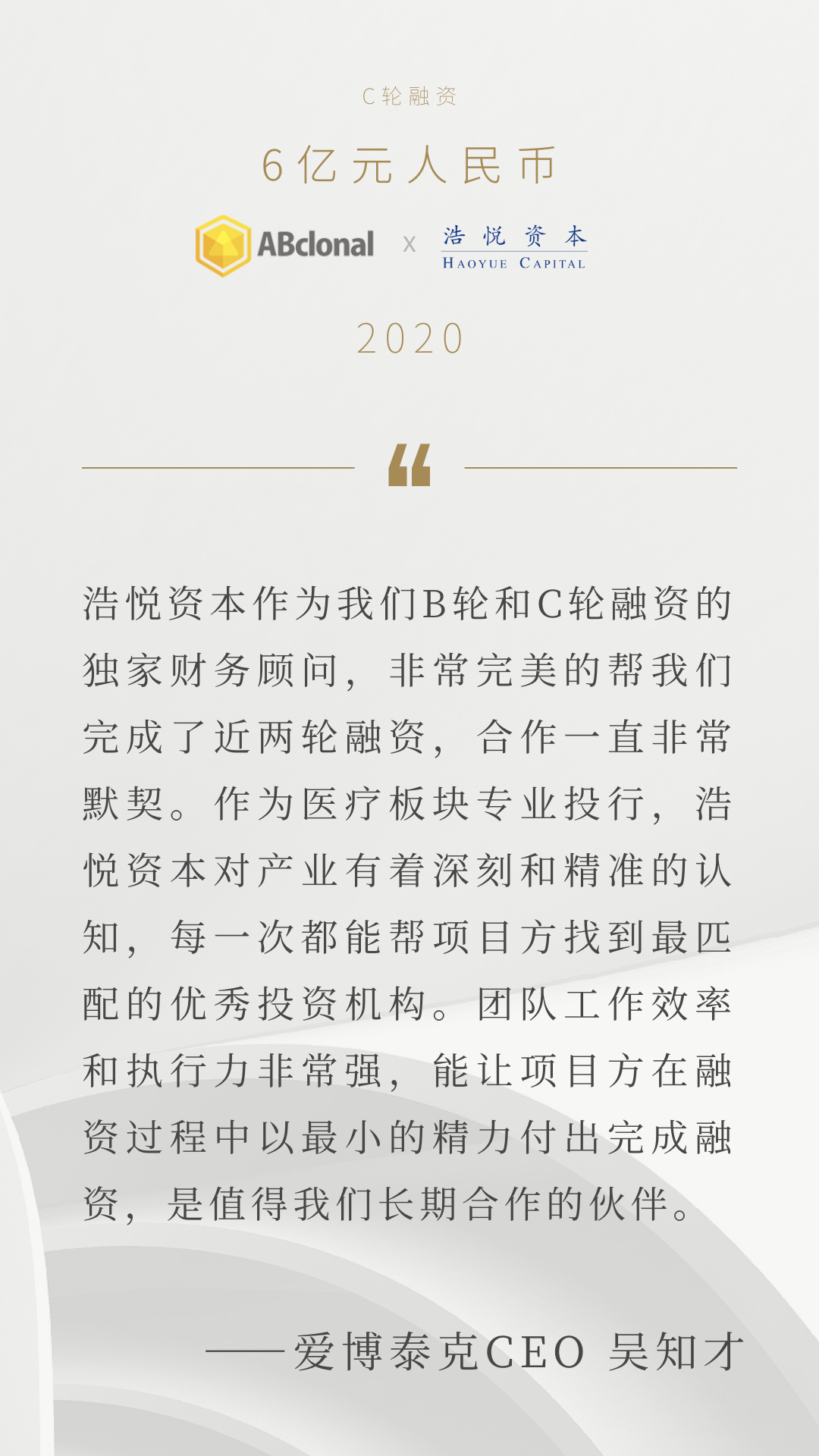 爱博泰克CEO吴知才表示,试剂原料是生命科学工具的最关键一环,原料创新是技术创新的源头,原料的质量决定了下游应用的效果。爱博泰克始终秉持做生命科学工具领域领导者的目标,从试剂原料领域起步,始终以打造高技术、高品质、让用户放心的产品为己任。公司自成立以来不间断投入研发,至今有第四代重组兔单抗、高通量分子酶筛选等大量世界领先的技术储备,更是我们在这一领域持续筑高壁垒的决心体现。爱博泰克未来将在生命科学工具行业持续横向扩张,立志为全球生命科学产业提供一站式解决方案。我们很荣幸本轮济峰资本、红杉资本中国基金等新股东进入,我相信在全体股东的支持下,爱博泰克将继续加速发展。同时也感谢浩悦资本团队,作为本轮融资的独家财务顾问,他们的专业与付出得到了大家的认可。