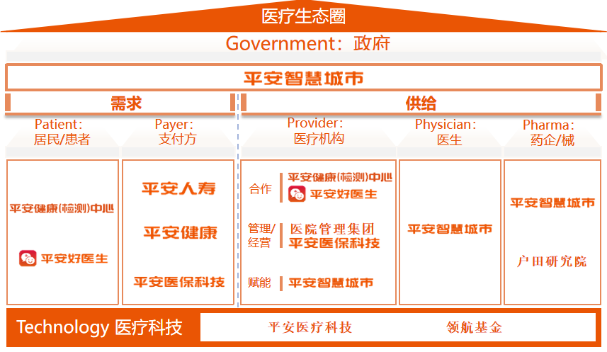作为其“医疗健康生态圈”战略的重要一环,中国平安斥资数百亿欲在全国建立1000家健康(检测)中心。目前已通过自建、共建、加盟、移动、托管等形式完成544家门店布局,辐射了大半个中国。 ▲ 平安好医医学检验实验室 从金融到医疗,从线上到线下 耕耘医疗健康险领域多年,中国平安深知中国医疗市场的巨大潜力和挑战。而科技创新,数字化经济带来的线上线下双轨并行红利,中国平安也早早纳入其战略布局。 2014年,中国平安带着“平安好医生”入局移动医疗,开启其医疗布局的线上模式,截止2019年市场占有率超过70%; 2015年,以推进分级诊疗,促进健康服务业发展为目标,平安开始在全国建设线下检测中心,开启其医疗布局的线下模式。 2019年,平安集团更加清晰地将“金融+生态”定义为其核心发展战略之一,在确保金融主业稳健增长的基础上转型升级,将创新科技深度应用于构建“金融服务、医疗健康、汽车服务、房产服务、智慧城市”五大生态圈。 线上线下“双轨并行”成就差异化优势 据权威大数据分析公司易观表示,平安好医生APP月活跃用户数(MAU)长期领跑于其他同类APP总和的3倍多;同时,在行业最主要的在线问诊市场占有率超过了70%。 疫情期间,其APP的在线咨询量更是大增,平台累计访问人次达11.1亿,新注册用户量增长10倍,新增用户日均问诊量是平时的9倍。 11月2日,国家医保局发布《关于积极推进“互联网+”医疗服务医保支付工作的指导意见》。这是政府发布的第一份详细的、包含明确时间表的线上医疗服务医保报销政策指导意见。 受惠于政策利好,中国平安在互联网医疗服务行业中已集聚了强大的流量优势。 通过线上科技赋能线下,智慧医疗技术领先于竞争对手,这或许是中国平安最大的差异优势。 正是依托这样的独有优势,中国平安以线下健康(检测)中心为“圆心”,打造了线上线下结合的医疗闭环,可以直接引流线上C端患者。同时也成为其核心医疗资源的聚集地,和多元化支付方式的实践场。
