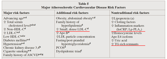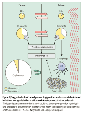 图1 美国临床内分泌医师协会(AACE)《血脂异常管理和预防心血管疾病指南》 图2 日本动脉粥样硬化学会(JAS)《预防动脉粥样硬化性心血管疾病指南》 图3 RLP-C致动脉粥样硬化机制 1.RLP-C是冠心病显著独立风险因素,可预测心血管事件 MASUOKA等[14]的研究结果显示,TG水平正常的冠心病患者血清RLP-C水平与冠状动脉狭窄显著相关(P=0.021)。NAKADA等[15]的研究结果显示,冠心病患者血清RLP-C水平明显升高,且独立于TG水平。因此,RLP-C水平成为了冠心病新的独立危险因素。 美国弗雷明汉心脏研究表明:>3000名参与者证明了残余胆固醇可以诊断和预测冠心病事件[16];Hironobu等[17]的研究结果表明,RLP-C水平升高是冠心病(CAD)的显著独立危险因素,可用于预测CAD事件和2型糖尿病患者未来心血管事件风险,如图4;Anette等[18]的研究结果显示:10万名参与者中非空腹RLP-C浓度逐步升高与全因死亡风险增加相关,而LDL-C不相关。 图4 RLP-C用于预测CAD事件和2型糖尿病患者未来心血管事件风险 2.RLP-C水平上升是心肌梗塞的危险因素 哥本哈根市心脏研究与哥本哈根缺血性心脏病研究证明:非空腹甘油三酯或计算出的残留胆固醇增加一倍的观察风险估计值,且RLP-C优于TG[12],如图5。 3.RLP-C水平升高是缺血性心脏病的危险因素 Jepsen A K等[19]的研究证明:RLP-C的增加是缺血性心脏病患者危险因素之一 ,且RLP-C的增加与低度炎症有因果关系,而LDL-C的增加无关炎症反应,如图6。 图6 RLP-C的增加是缺血性心脏病患者危险因素 4.检测RLP-C在肥胖人群中也适用 哥本哈根研究(10万人)[4]证明:RLP-C水平与BMI呈正相关,如图7;且RLP-C水平升高与正常体重,超重和肥胖的人群心肌梗塞风险升高均相关,如图8。致病机制为RLP-C在血管壁富集,导至动脉粥样硬化。 图7 RLP-C水平与BMI呈正相关 图8 RLP-C水平升高与正常体重,超重和肥胖的人群心肌梗塞风险升高均相关 除此之外,还有日本学者Matsuo N等[20]研究证明,RLP-C水平与斑块坏死程度正相关;与斑块纤维化负相关,是一个可用于评估斑块稳定性的新型指标,帮助临床预测心血管事件风险。 日益增多的证据表明RLP-C的升高是CAD和全因死亡率的危险因素,因此CAD的防治不仅要以LDL-C为主要目标,同时也需注意对非空腹RLP-C水平的控制。但仍需大型随机临床干预试验证明降低RLP-C浓度是否可相应地降低冠心病风险,同时以非空腹RLP-C为控制目标的药物临床试验也值得期待。 参考文献: [1] 吴娜琼. 日本动脉粥样硬化学会家族性高胆固醇血症诊治指南解读[J]. 中国循环杂志, 2018(S2).. [2] 梁依, 赵文君, 郭艺芳. 2017年AACE/ACE血脂异常管理与动脉粥样硬化疾病预防指南简介[J]. 中国心血管杂志, 2017, 22(004):235-237. [3] 陈涛, 袁祖贻. 《2016年欧洲心脏病学会/欧洲动脉粥样硬化学会血脂异常管理指南》解读[J]. 中国介入心脏病学杂志, 2016, 24(011):616-618. [4] Averna M , Stroes E , Ogura M , et al. How to assess and manage cardiovascular risk associated with lipid alterations beyond LDL[J]. Atherosclerosis Supplements, 2017, 26:16-24. [5] Mora S, Wenger NK, Demicco DA, Breazna A, Boekholdt SM, Arsenault BJ et al. Determinants f residual risk in secondary prevention patients treated with high- versus low-dose statin therapy: the Treating toNewTargets (TNT) study. Circulation 2012;125:1979 – 87. [6] Chapman MJ, Ginsberg HN, Amarenco P, Andreotti F,Boren J, Catapano AL et al. Triglyceride-rich lipoproteins and high-density ipoprotein cholesterol in patients at high risk of cardiovascular disease: evidence and guidance for management. Eur Heart J 2011;32: 1345– 61. [7] Sampson UK, Fazio S, Linton MF. Residual cardiovascular risk despite optimal LDL cholesterol reduction with statins: the evidence, etiology, and therapeutic challenges.Curr Atheroscler Rep 2012;14:1–10. [8] Langlois M R , Chapman M J , Cobbaert C , et al. Quantifying Atherogenic Lipoproteins: Current and Future Challenges in the Era of Personalized Medicine and Very Low Concentrations of LDL Cholesterol. A Consensus Statement from EAS and EFLM[J]. Clinical Chemistry, 2018:clinchem.2018.287037. [9] 中国成人血脂异常防治指南修订联合委员会. 中国成人血脂异常防治指南(2016年修订版)[J]. 中国循环杂志,2016,31(10):937-950. [10] COHN J S,MARCOUX C,DAVIGNON J. Detection,quantification, and characterization of potentially atherogenic triglyceride-rich remnant lipoproteins[J].Arterioscler Thromb Vasc Biol,1999,19(10):2474-2486. [11] ASSMANN G,SCHULTE H. Relation of high-density liporotein cholesterol and triglycerides to incidence of atherosclerotic coronary artery disease(the PROCAM experience). Prospective cardiovascular münster study[J].Am J Cardiol,1992,70(7):733-737. [12] Jørgensen Anders Berg, Ruth F S , Sode W A , et al. Genetically elevated non-fasting triglycerides and calculated remnant cholesterol as causal risk factors for myocardial infarction[J]. European Heart Journal(24):1826. [13] Børge, G, Nordestgaard, et al. Triglycerides and cardiovascular disease[J]. The Lancet, 2014. [14] MASUOKA H,KAMEI S,OZAKI M,et al. Predictive value of remnant-like particle cholesterol as an indicator of coronary artery stenosis in patients with normal serum triglyceride levels[J]. Intern Med,2000,39(7):540-546. [15] NAKADA Y,KUROSAWA Y,TOHYAMA J,et al.Increased remnant lipoprotein in patients with coronary artery disease-evaluation utilizing a newly developed remnant assay, remnant lipoprotein cholesterol homogenous assay (RemL-C)[J]. J Atheroscler Thromb,2007,14(2):56-64. [16] Mcnamara J R , Shah P K , Katsuyuki N , et al. Remnant lipoprotein cholesterol and triglyceride reference ranges from the Framingham Heart Study[J]. Clinical Chemistry, 1998(6)