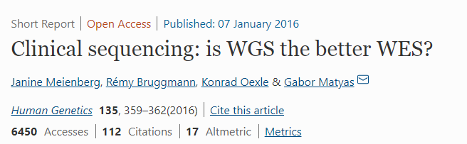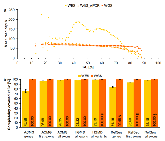 对于如何将下一代测序技术(Next-Generation Sequencing,NGS)以最佳的方式应用于孟德尔遗传病的诊断一直以来都存在着大量的讨论。基因panels相对来说比较受青睐是由于这种方式它的测序成本低、报告周期短、有较低的非特异性以及更少的额外发现,并且,panels只漏检了全外显子测出的约10%的突变。实际上,与病人表型相关联的基因panels检测可以被视作一种廉价的、快速的检测方式。如果panels的检测结果是阴性的,然后再考虑WGS或者WES来进行一个更为全面的二次检测。 对于WGS来说,全基因组范围内的检测覆盖率让拷贝数变异(Copy Number Variations,CNV)的检出更为可信,这对提高疾病的检出率起到了实际性的作用。WGS的价格正在逐步下跌,包含数据分析在内的发放报告周期也可以缩短至几天。实际上,在进行panels检测时,数据分析可以在电脑上操作过滤以避免一些偶然结果的发现,并且这种检测手段的临床检出率高达73 %,比传统的表型导向的单基因分析检出率高出了一个数量级。我们最近发现,即使在现阶段,WES还是不能完全有效地覆盖所有的外显子,因此即使这种非捕获方式的WGS对于高GC区的敏感度不是那么高,但是它相对于WES还是能够更大范围地覆盖基因组的外显子区域。在这篇文章里,我们以一种全新的视野去认识这种无扩增的、并且提供了迄今为止最全面的基因组外显子覆盖度的WGS技术。并且,我们认为WGS应该作为更优于WES的一种更全面的二次检测手段。我们用5名女性的DNA样本对优化的WES与WGS来做一个比较。WES让供应商V2用HiSeq 2000 平台以100×的测序深度测序,WGS让供应商V4用HiSeq X Ten系统以60×的深度测序。为了最大程度地降低系统误差,我们将比较范围限制在Ref-Seq编码序列区域。我们当前的数据表明这种新型的无扩增WGS(PCR-free WGS)对高GC区域的敏感度比较低,这样就会导至这种技术相对于WES以及有扩增的WGS有一个更为均一的覆盖度(图a)。 尽管平均测序深度低了将近一倍,无扩增WGS所检测出来的RefSeq编码外显子数量还是远远大于WES。而对于ACMG推荐报告的突变基因,无扩增WGS把5个样本中所有的位点都报了出来,而WES只报了98.25%的ACMG外显子,导至的结果是WES对ACMG基因的报告率只有75.56%。另外一个值得注意的针对这两种技术的临床相关的不同之处存在于外显子的覆盖范围上,比如HGMD数据库报道过的致病性的突变(包括单核苷酸变异、小片段的插入和缺失等),无扩增WGS能够100%地检出这些突变,而WES只能检出98.22%。因此,也就是说WES不能检出目前已明确的外显子致病性突变的概率为0.42%,而无扩增WGS都可以检测出来。考虑到非编码区也会存在致病性的突变,因此,WES漏掉的总致病性变异占0.81%,而这些变异都是目前存在于HGMD数据库中并且可以被WGS检测出的(图b)。 另外,全基因组范围内的检测使得WGS相较于WES来说更适合用来进行针对CNV的检测。在我们的样本中,WES个体外显子覆盖度的变异系数比无扩增WGS高出大约4倍。并且,这种无间隙测序的WGS也能检测结构变异(SVs)。因此,我们认为WGS是极有可能取代微阵列来检测CNVs,但是WES却不能。WGS拥有高通量的测序容量,目前也已具备相应的硬件和软件设施来储备和解读庞大的WGS数据,因此可以在全世界各个实验室应用。从另一角度来说,测序成本的逐步降低也会让这种技术的价格变得越来越亲民。对于目前未解决的医学问题,WGS就只需要把之前测序的数据进行重分析,而不需要像WES那样,可能就需要对个体进行重新测序。另外,也有人会认为WGS会检测出更多与病人目前的疾病不相关的一些突变以及检测出一些临床意义不明的变异,这些都可以通过将WGS的分析数据量减少以控制在特定的感兴趣的基因panels上来避免这些额外的发现。因此,不仅我们,还有其他很多同行都认为,在检测外显子突变上,WGS相对于WES更有优势,并且在将来,应用NGS进行孟德尔遗传病的诊断不需要再涉及捕获测序这种方式。总之,这种新型的无扩增WGS是目前为止可以最广泛地覆盖外显子以及临床相关的基因测序区域的一种技术。WGS的优势不仅仅体现在可以检测出非编码的致病性变异,还体现在它具有更为广泛的外显子覆盖度,所以它是优于WES的一种技术。王小艳,湖北省妇幼保健院检验科遗传室,13年硕士研究生毕业于中南大学医学遗传学国家重点实验室 |