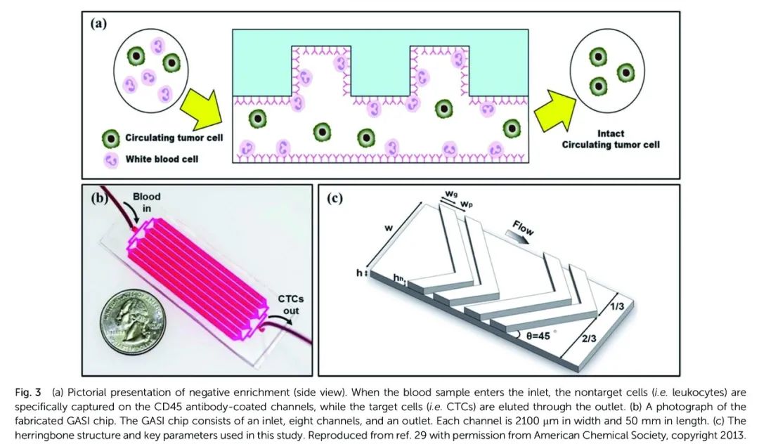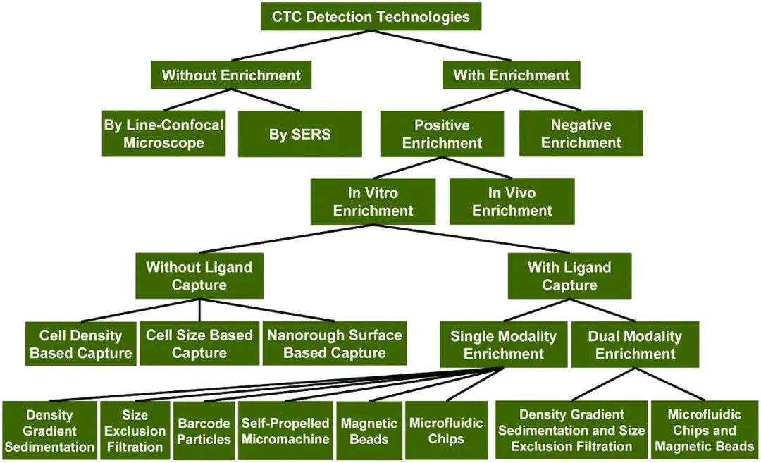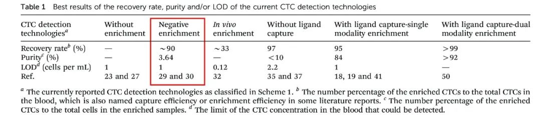 循环肿瘤细胞(CTCs)是肿瘤细胞从原始或转移肿瘤组织上自然脱落后在血液中循环,并可导至新的转移。CTC检测是对抗癌症的关键工具,可用于早期诊断、治疗监测、复发监测和用药指导。Zheyu Shen等在权威杂志《Chemistyr Society Reviews》(IF=42.846)上发表题为《Current detection technologies for circulating tumor cells》的文章,对目前报道的CTC检测技术进行了分类,总结了优点和局限性。 目前开发的CTC检测技术一般分为四个步骤:(1)捕获,(2)富集,(3)检测,(4)释放。捕获步骤是CTCs与材料(如物理相互作用和抗体/抗原相互作用)之间的特定相互作用,如磁珠,微流控芯片;富集步骤是指从血液中分离CTCs;富集后,CTCs可以通过荧光(如荧光显微镜,荧光分光度计和流式细胞仪)[1, 2]、表面增强拉曼散射(SERS)[3]或电阻抗[4]进行检测;CTCs释放后可进行进一步的表型鉴定和分子分析(如RNA分析和细胞代谢分析)。 当前CTC检测技术分类技术树 这些CTCs检测技术的重要技术指标包括回收率、纯度和检出限(LOD),见表1。回收率定义为富集CTCs在血液中占总CTCs的数量百分比,也称捕获效率或富集效率。纯度是指富集CTCs的数量占富集样品中细胞总数的百分比。LOD是可检测到血液中CTCs的最低浓度。 01 不富集的CTC技术 没有富集步骤的CTCs检测也称为直接检测,包括扫描共聚焦显微镜和表面增强拉曼散射(SERS)技术。 共聚焦显微镜技术 共聚焦显微镜技术是一种快速、自动化的高通量筛选方法,基于微流体和多波长扫描共焦探测技术而开发[5]。血液中的细胞首先同时标记多个抗体,这些抗体与不同的荧光剂结合。血液通过微流控通道被泵出,用共聚焦显微镜扫描,根据荧光信号和标记方法,可以自动计数和报告CTCs的数量。 特点:(1)由于微流控通道中的流速有限,每个样本的检测时间太长(分析7.5mL的血液需要3.5h左右);(2)假阴性率达到40%以上;(3)由于需要几种荧光染料结合抗体来标记血液中的细胞,导至样品的检测成本较高;(4)不能分离CTCs进行下游表型鉴定和分子分析。 SERS直接检测 SERS是另一种快速分析外周血中CTCs的方法,它是基于具有靶向配体的高度特异性和敏感的SERS活性纳米颗粒来识别健康血细胞中的CTCs。首先将外周血样本添加到外周血淋巴细胞分离介质中,然后在室温下离心。含有白细胞(WBCs)和CTCs的低密度细胞层被转移到新的管中,与SERS活性纳米粒子孵育,并用磷酸盐缓冲盐水(PBS)洗涤,最后利用拉曼系统对样品的SERS光谱进行分析[6, 7]。 特点是:(1)CTC检测过程不易自动化;(2)需要配体来捕获血液中的CTCs,检测试剂成本高;(3)不能分离CTCs进行下游表型鉴定和分子分析。 02 需要富集的CTC技术 血液中低浓度的CTCs可以通过两种不同的方式富集。一种是阴性富集,捕获非目标细胞和洗脱靶细胞;另一种方法是阳性富集,捕获CTCs并洗脱健康血细胞。 阴性富集 Lara等首次开发了一种阴性富集技术来获取血液中的稀有细胞,富集过程包括红细胞裂解、CD45抗体筛选白细胞、流过系统进行免疫磁选,最后使用自动细胞计数、过滤和视觉计数或细胞螺旋分析进行细胞分析过程[8]。为了提高CTC负富集的效率,Hyun[9]等开发了一种几何活化表面相互作用(GASI)的微流控芯片,利用人字形有效地捕获大量血液细胞(3a)。通道为人字形结构,可产生横向流动,促进细胞上的抗原与通道表面的抗体之间的有效接触(3b和c)。这是第一次尝试用负富集微流控芯片从转移性癌症患者中富集CTCs。该GASI芯片成功地富集了CTCs,同样的方法可能有助于收集其他类型的循环稀有细胞,其表型尚不清楚。在1毫升血液中,分离的CTCs的数量从1到51不等。 阴性富集CTC检测技术特点包括:(1)不依赖于CTCs的生物标志物表达(如EpCAM);(2)可收集完整的CTCs,可进行细胞和分子分析等下游研究;(3)易于自动化。 阳性富集 阳性富集捕获CTCs并洗脱健康血细胞,分为体内富集和体外富集。