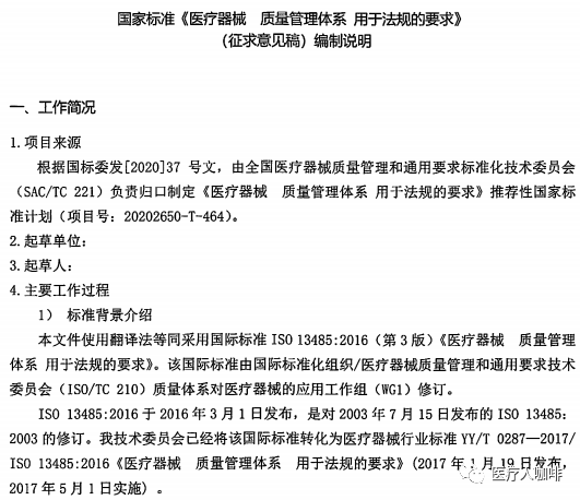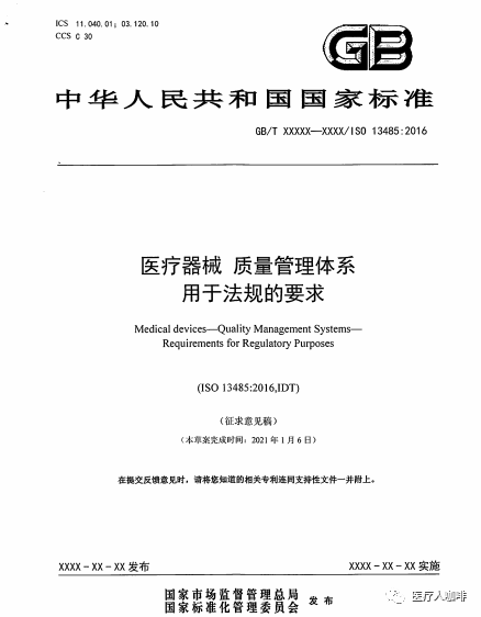 近日,国家药监局医疗器械标管中心官方发布征求《医疗器械 质量管理体系 用于法规的要求》推荐性国家标准(征求意见稿)意见的通知。为推动医疗器械监管及产业健康持续发展,申请将ISO13485:2016转化为推荐性国家标准。由此,YY/T0287:2017也将改为GB/T。详情如下: