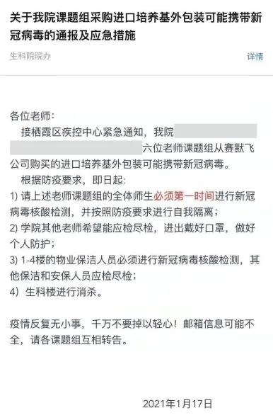 日前,有读者向《生物世界》透露,南京某高校群发邮件通知,该校生科院部分课题组采购的进口培养基外包装可能携带新冠病毒,并要求这些课题组全部成员接受核酸检测、自我隔离。