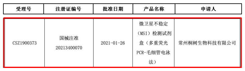 精准的肿瘤分子诊断,是提高肿瘤患者总体生存期的重要前提。其中,微卫星不稳定(MicroSatellite Instability,MSI)因其临床意义颇为广泛(包括辅助诊断林奇综合征、判断预后、预测辅助化疗疗效、预测实体瘤免疫治疗疗效),特别是MSI-H肿瘤特有的免疫敏感性备受业界关注。据统计,中国MSI-H肿瘤疾病负荷每年高达32.4万例,疾病负荷极高。但是,缺乏经过官方认证的标准化产品提供给临床肿瘤患者。 近日,常州桐树生物科技有限公司(桐树基因)自主研发生产的“微卫星不稳定(MSI)检测试剂盒(多重荧光PCR-毛细管电泳法)”通过国家药品监督管理局(NMPA)的审核,已于2021年1月26日获批用于体外定性检测结直肠癌患者肿瘤组织FFPE样本的“2B3D”(BAT-25、BAT-26、D5S346、D2S123、D17S250)微卫星位点状态,并取得国内首张微卫星不稳定检测III类医疗器械证书(国械注准20213400070)。该试剂盒是中国首个基于“多重荧光PCR-毛细管电泳法”的MSI检测试剂盒,通过注册生产质量体系的审查考核,NMPA经过严格审查终于颁出这意义深远的“MSI第一张III类证”,也是国内肿瘤基因检测的一个“里程碑”! |