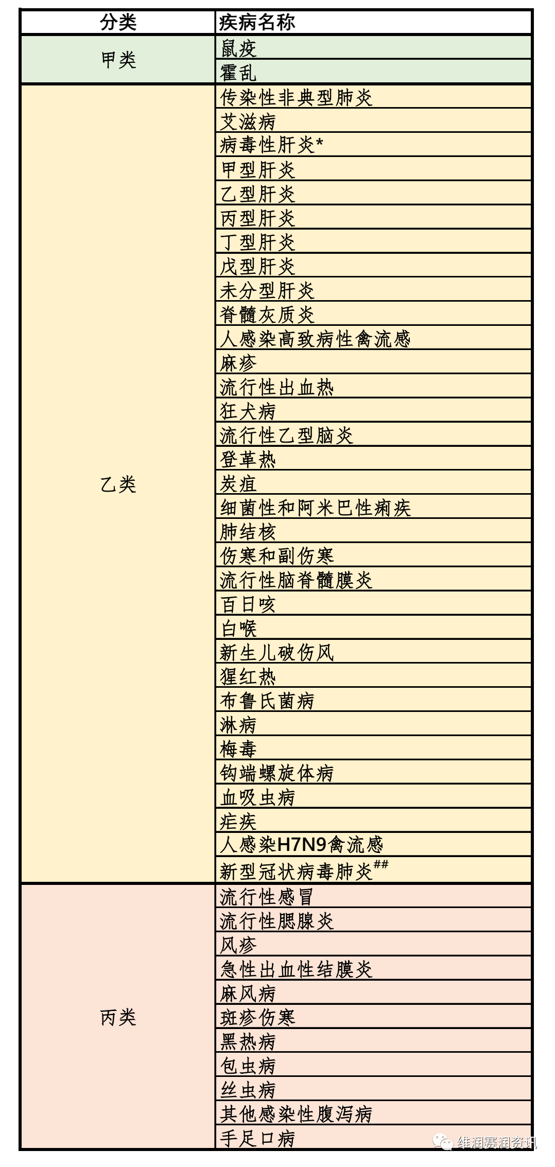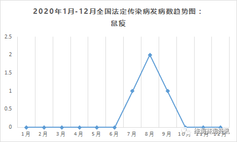 数据来源:中国疾病预防控制中心、疾病预防控制局 传染病〔Infectious Diseases〕是由各种病原体引起的能在人与人、动物与动物或人与动物之间相互传播的一类疾病。中国目前的法定报告传染病分为甲、乙、丙3类,共40种。此外,还包括国家卫生计生委决定列入乙类、丙类传染病管理的其他传染病和按照甲类管理开展应急监测报告的其他传染病。具体分类及名称如下: 根据中国疾病预防控制中心、疾病预防控制局2020年每月公布的全国法定传染病疫情统计表进行汇总整理,现将甲类和丙类法定传染病的发病数趋势图展示如下。 甲类传染病:2种 2020年 甲类传染病总发病数:15例 鼠疫:4例 霍乱:11例 乙类传染病:27种 2020年 乙类传染病总发病数:3220004例 传染性非典型肺炎:0例 艾滋病:63154例 病毒性肝炎*:1413126例 甲型肝炎:15481例 乙型肝炎:1139133例 丙型肝炎