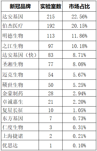 2021年全国新型冠状病毒核酸检测(接收集中隔离点样本检测机构)室间质评活动共有来自28个省(市、自治区)的共1102家实验室参加。实际共收到950家实验室的有效结果,其中EQA/PT成绩合格的实验室933家(98.2%),不合格实验室17家(1.8%)。根据临检中心公布的报告来看,此次接收集中隔离点样本检测机构新冠核酸检测试剂占比较高的品牌分别为达安基因(22.56%)、伯杰医疗(20.15%)、明德生物(11.86%)、之江生物(10.18%)等。 虽然此次参加国家卫健委室间质评的新冠核酸检测机构为接受集中隔离点样本检测机构,1月份质评参与机构仅有950家,多集中在四川(130家)、浙江(107家)、湖南(103家)、山东(76家)、陕西(77家)新疆(80家)等。而随着各地散发疫情的不同,参与该项室间质评的检验机构也会发生变化,因此本次所得品牌市占比仅为参考数据,仅为参加1月份950家接收集中隔离点样本检测机构中的新冠检测试剂占比!