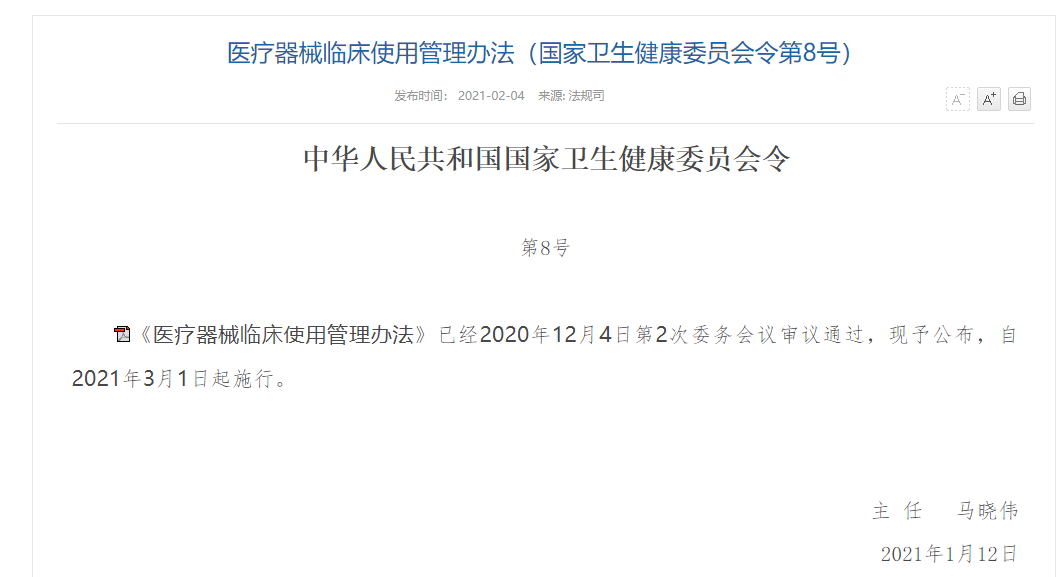 《医疗器械临床使用管理办法》已经2020年12月4日第2次委务会议审议通过,现予公布,自2021年3月1日起施行。