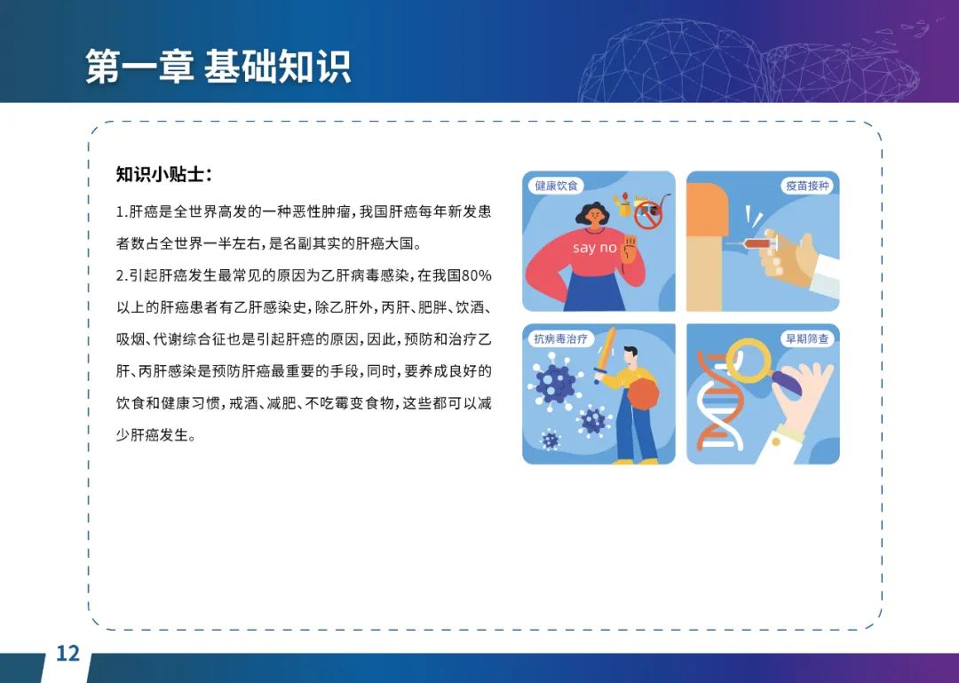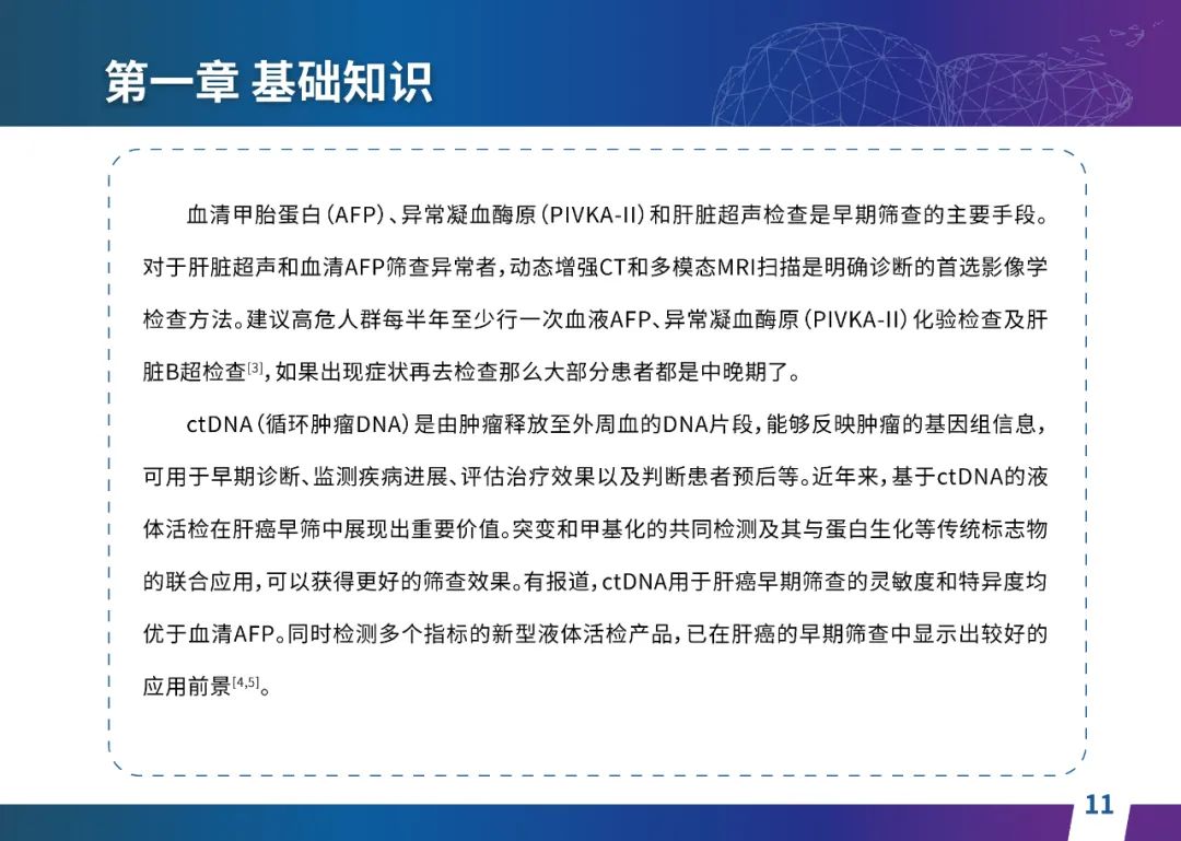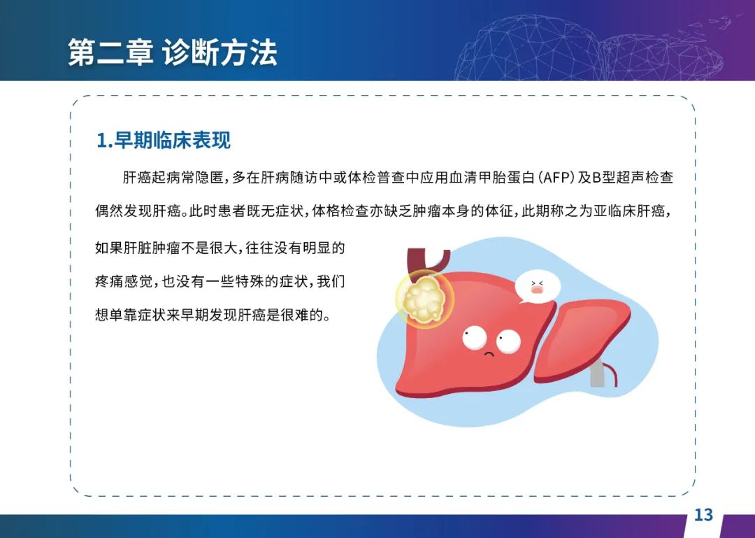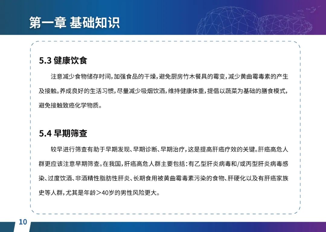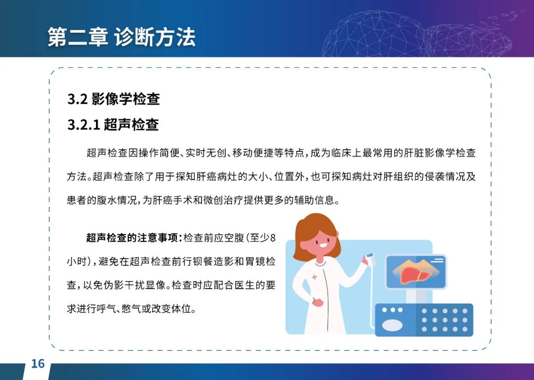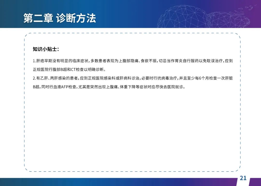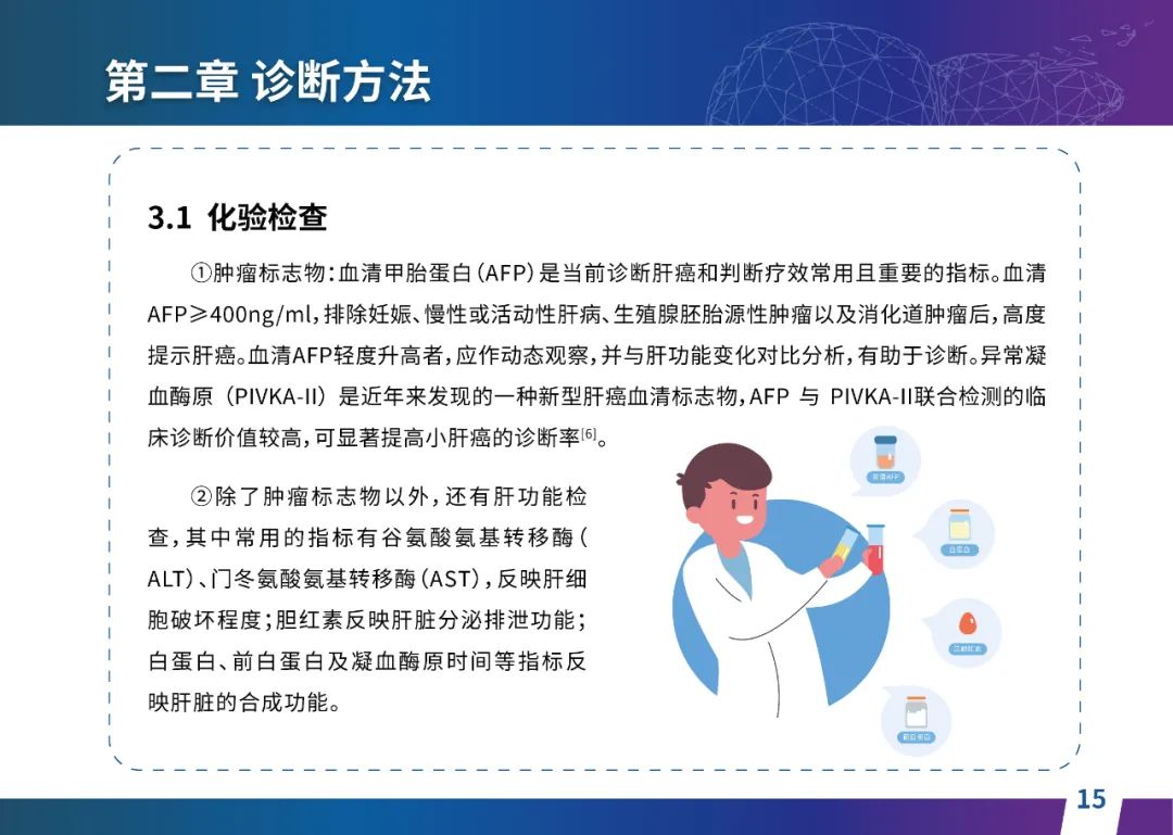 关于肝癌筛查手段,指南也提出了建议:肿瘤标志物血清甲胎蛋白(AFP)、异常凝血酶原(PIVKA-II)和肝脏超声检查是早期筛查的主要手段。对于肝脏超声和血清AFP筛查异常者,动态增强CT和多模态MRI扫描是明确诊断的首选影像学检查方法。建议高危人群每半年至少行一次血液AFP、异常凝血酶原(PIVKA-II)化验检查及肝脏B超检查,如果出现症状再去检查那么大部分患者都是中晚期。值得注意的是,基于ctDNA的液体活检肝癌早筛技术也被纳入指南建议:“ctDNA(循环肿瘤DNA)是由肿瘤释放至外周血的DNA片段,能够反映肿瘤的基因组信息,可用于早期诊断、监测疾病进展、评估治疗效果以及判断患者预后等。近年来,基于ctDNA的液体活检在肝癌早筛中展现出重要价值。突变和甲基化的共同检测及其与蛋白生化等传统标志物的联合应用,可以获得更好的筛查效果。有报道称,ctDNA用于肝癌早期筛查的灵敏度和特异度均优于血清AFP。同时检测多个指标的新型液体活检产品,已经在肝癌的早期筛查中显示出较好的应用场景。”《健康中国2030纲要》提出“推动基层肿瘤防治科普,提升癌症五年生存率,开展全民肿瘤防治科普宣传,建立健康生活方式,远离癌症高危因素;推动基层癌症早诊早治的科普宣传和技术突破”,撰写患者指南有助于指导国家癌症防控目标的落地,开展肿瘤防治科普宣传有利于全民健康。