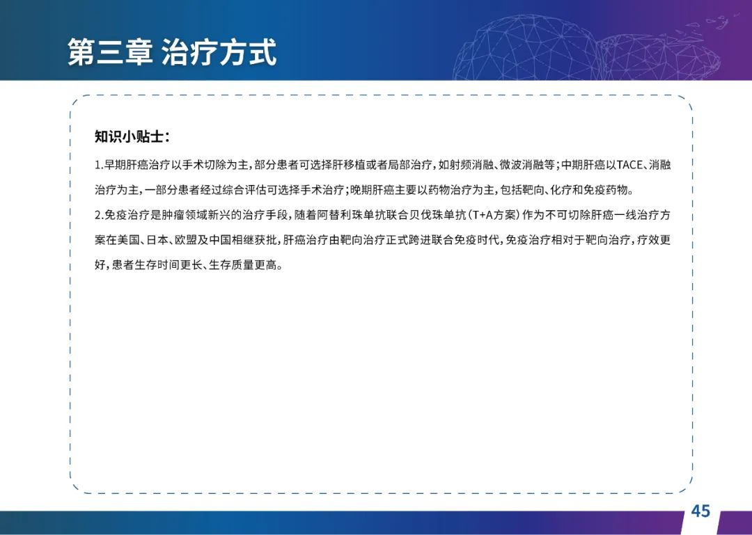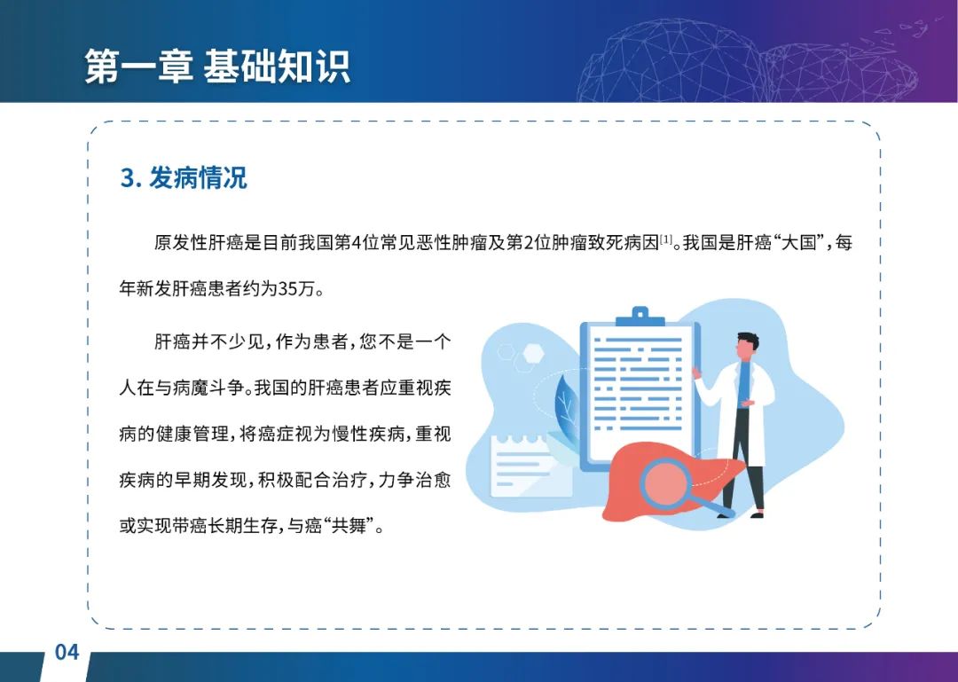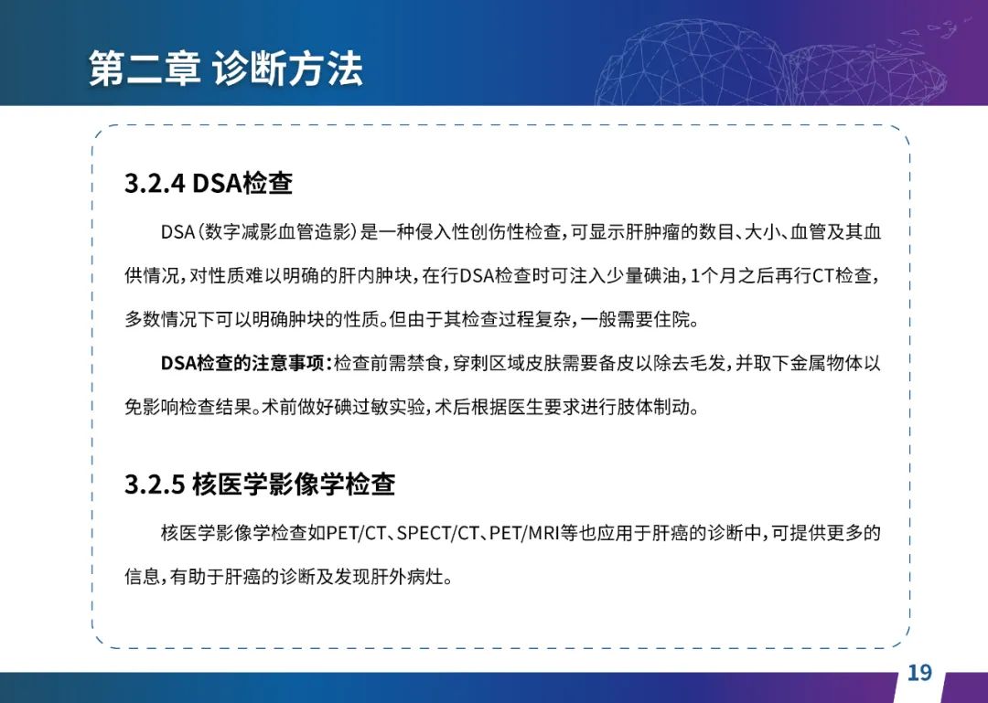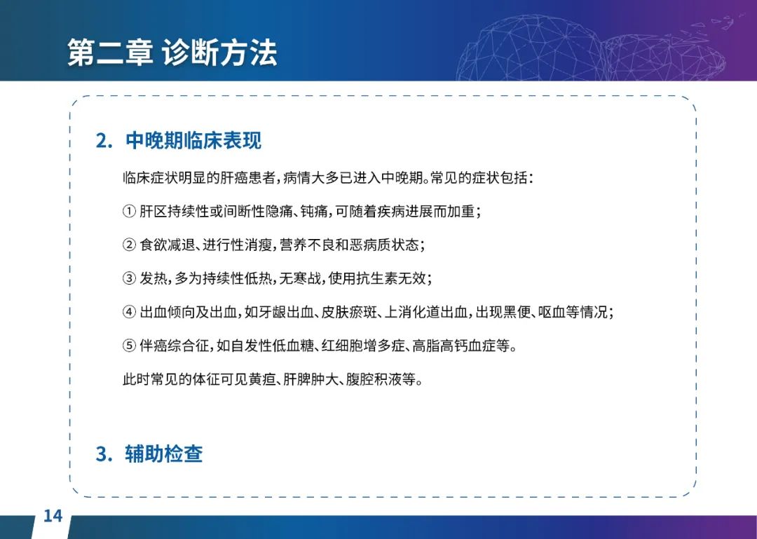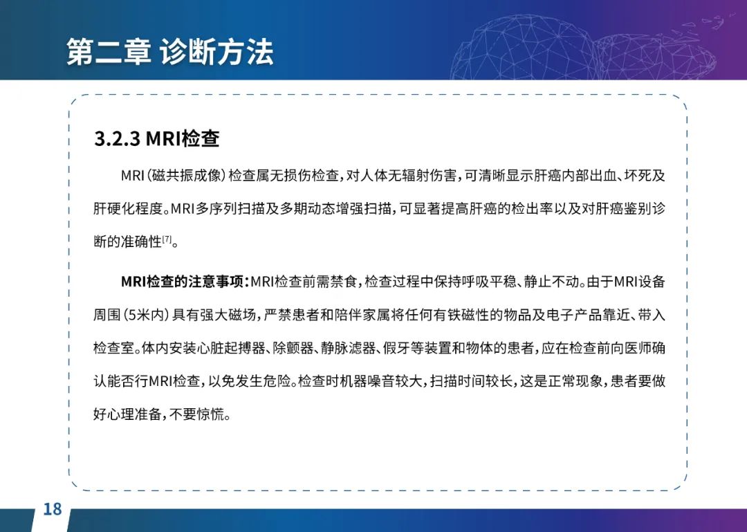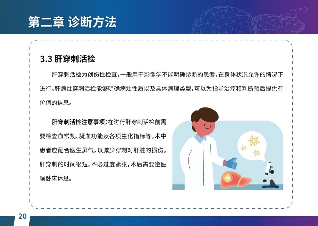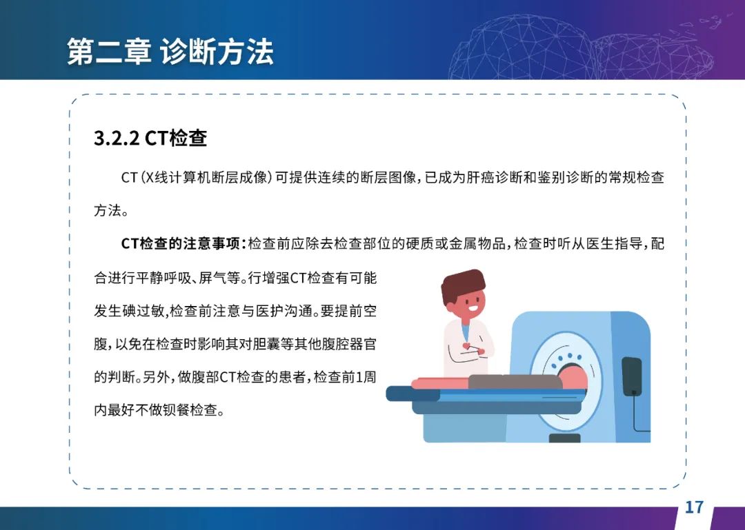 关于肝癌筛查手段,指南也提出了建议:肿瘤标志物血清甲胎蛋白(AFP)、异常凝血酶原(PIVKA-II)和肝脏超声检查是早期筛查的主要手段。对于肝脏超声和血清AFP筛查异常者,动态增强CT和多模态MRI扫描是明确诊断的首选影像学检查方法。建议高危人群每半年至少行一次血液AFP、异常凝血酶原(PIVKA-II)化验检查及肝脏B超检查,如果出现症状再去检查那么大部分患者都是中晚期。值得注意的是,基于ctDNA的液体活检肝癌早筛技术也被纳入指南建议:“ctDNA(循环肿瘤DNA)是由肿瘤释放至外周血的DNA片段,能够反映肿瘤的基因组信息,可用于早期诊断、监测疾病进展、评估治疗效果以及判断患者预后等。近年来,基于ctDNA的液体活检在肝癌早筛中展现出重要价值。突变和甲基化的共同检测及其与蛋白生化等传统标志物的联合应用,可以获得更好的筛查效果。有报道称,ctDNA用于肝癌早期筛查的灵敏度和特异度均优于血清AFP。同时检测多个指标的新型液体活检产品,已经在肝癌的早期筛查中显示出较好的应用场景。”《健康中国2030纲要》提出“推动基层肿瘤防治科普,提升癌症五年生存率,开展全民肿瘤防治科普宣传,建立健康生活方式,远离癌症高危因素;推动基层癌症早诊早治的科普宣传和技术突破”,撰写患者指南有助于指导国家癌症防控目标的落地,开展肿瘤防治科普宣传有利于全民健康。