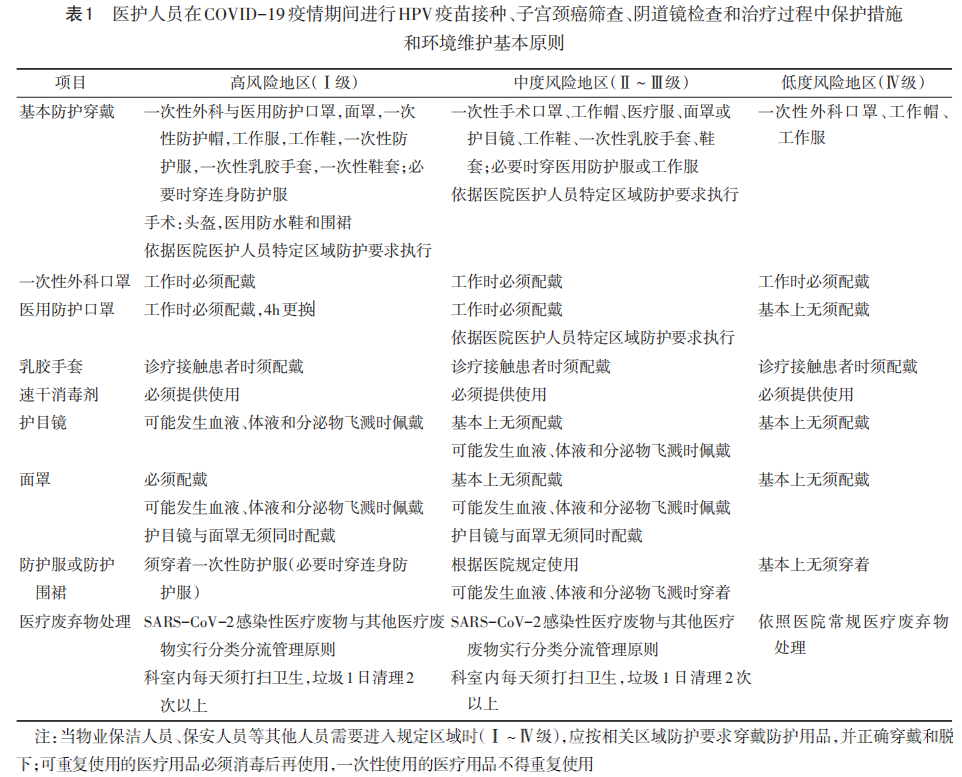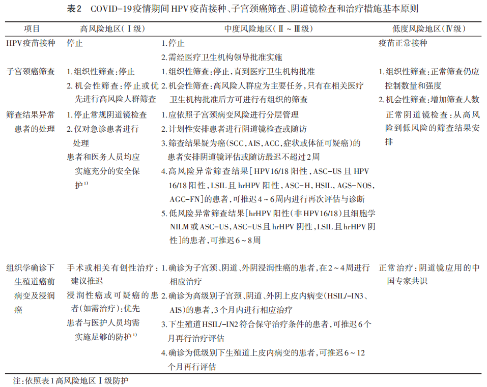 本文刊登于《中国实用妇科与产科杂志》2021,37(2):185-189 DOI:10.19538/j.fk2021020114 【引用本文】中国医师协会妇产科医师分会阴道镜及子宫颈病变专业委员会.新型冠状病毒肺炎疫情防控期间子宫颈癌三级防控综合管理中国专家共识[J].中国实用妇科与产科杂志,2021,37(2):185-189. 作者:中国医师协会妇产科医师分会阴道镜及子宫颈病变专业委员会 基金项目:中国医学科学院创新医学计划(CAMS-I2M;2017-I2M-1-002) 通讯作者:郎景和,中国医学科学院北京协和医院妇产科,北京 100730 电子信箱:langjh@hotmail.com 1 疫情期间子宫颈病变专科门诊的防护 1.1 阴道镜检查和下生殖道病变门诊手术操作人员防护 虽然目前证据表明下生殖道中SARS-CoV-2的存在风险较低,但在治疗过程中,医护人员仍有暴露于SARS-CoV-2的风险,操作人员须严格遵循《新型冠状病毒感染的肺炎防控中常见医用防护用品使用范围指引(试行)》[4]实施防护,详见表1。 1.2 标本的处理与转运 无论细胞学标本、阴道分泌物、活检组织学标本均应设置固定的标本收集区并定期进行区域消毒。标本应放置于隔离防漏运输盒内由专门的物流人员进行传输,禁止患者或家属进行标本传送。物流人员与标本接收人员应穿戴符合该风险等级的标准防护服装并避免直接接触标本。人员完成标本传送后及时进行清洗和消毒。建立可追踪的传输人员和标本登记记录[3]。 1.3 医疗垃圾处理 需严格依照国家传染病与应急相关法律法规和《新型冠状病毒感染的肺炎疫情医疗废物应急处置管理与技术指南(试行)》[5]处理医疗垃圾。见表1。 2 疫情期间子宫颈癌三级防控综合管理 2.1 高风险地区(公共卫生事件特别重大Ⅰ级) 2.1.1 HPV疫苗接种 应停止接种HPV疫苗。 2.1.2 子宫颈癌筛查 应停止人群的计划性筛查。待疫情风险降级后依照风险管控原则,推荐优先恢复子宫颈癌高风险人群的医院机会性筛查,再有计划地恢复群体子宫颈癌筛查。 2.1.3 对筛查结果异常患者的处理 建议停止常规阴道镜检查,仅对急诊患者进行处理。如必须进行阴道镜评估时,患者与医护人员均需实施足够防护。 2.1.4 对确诊下生殖道癌前病变及浸润癌患者的处理 建议推迟手术或相关有创性治疗,如必须进行手术治疗时,应以浸润性癌的患者或可疑癌的患者为优先。患者与医护人员均需实施足够的防护。 2.2 中风险地区(公共卫生事件Ⅱ级与Ⅲ级) 2.2.1 HPV疫苗接种 需经相关医疗卫生机构核准疫情风险后方可实施。 2.2.2 子宫颈癌筛查 以子宫颈癌高风险人群的医院机会性筛查为主,计划性的筛查仍需经相关医疗卫生机构依据疫情风险核准计划后方可实施。 2.2.3 筛查结果异常患者的处理 应依照子宫颈癌及子宫颈病变风险进行分层管理。计划性安排阴道镜评估或随访[9]。筛查结果疑为鳞状上皮细胞癌(SCC)、腺细胞癌(ACC)、原位腺癌(AIS),症状或体征提示癌的患者应立即安排阴道镜评估,最迟不超过2周。高风险异常筛查结果[HPV16/18阳性;意义不明的非典型鳞状上皮细胞(ASC-US)且HPV16/18阳性;子宫颈低度鳞状上皮内病变(LSIL)且HR-HPV阳性;高级别鳞状上皮内病变(ASC-H);子宫颈高度鳞状上皮内病变(HSIL);非典型腺细胞来源不明(AGS-NOS),非典型腺细胞倾向瘤变(AGC-FN)]的患者,应在获得筛查结果后4~6周内进行阴道镜检查。低风险异常筛查结果[非16/18型HR-HPV阳性且未见上皮内病变细胞和恶性细胞(NILM)或ASC-US,ASC-US且HR-HPV阴性,LSIL且HR-HPV阴性]的患者,在没有临床症状或患特定风险因素时,可在遵循《子宫颈癌筛查管理共识》的基础上推迟6~8周内进行相应处理。 2.2.4 确诊下生殖道癌前病变及浸润癌患者的处理 组织学可疑或确诊为子宫颈、阴道、外阴浸润性癌的患者,建议在2~4周内安排进一步评估及后续治疗。经组织学确诊为高级别子宫颈、阴道、外阴上皮内病变[HSIL/-上皮内瘤变3级(IN3)、AIS]的患者,推荐在3个月内进行相应治疗。对于下生殖道HSIL/-IN2符合保守治疗条件的患者,可以推迟6个月再行治疗评估。经组织学确诊为低级别下生殖道上皮内病变的患者,可以推迟6~12个月再行评估。已进行手术治疗的患者,首次随访应在治疗后的6个月内完成,最迟不应超过12个月。随访方式应包括细胞学和HR-HPV(有条件者可以采用HPV自采样)。随访结果可以通过电话、网络等方式告知患者并给予相应医疗建议。随访中出现异常结果时应按照上述疫情期间筛查结果异常的管理流程进行处理。 2.3 低风险地区(公共卫生事件Ⅳ级) 2.3.1 HPV疫苗接种 正常疫苗接种。 2.3.2 子宫颈癌筛查 恢复计划性子宫颈癌筛查的同时,可适当加强医院子宫颈癌机会性筛查的人数与强度,降低因疫情期间延误筛查所造成的子宫颈癌风险。 2.3.3 筛查结果异常患者的处理 应积极依照患者数据库高至低级别筛查结果完成疫情前未完成的阴道镜评估与随访。 2.3.4 确诊下生殖道癌前病变及浸润癌患者的处理 应按照《阴道镜应用的中国专家共识》[8]对患者进行治疗与管理。详见表2。 3 疫情期间子宫颈病变患者的心理疏导 疫情期间,子宫颈病变患者因诊治的延迟或中断可产生不同程度的心理问题如:恐惧、焦虑、抑郁等。推荐医护人员利用电话、微信、视频通信、医疗互联网等资源对患者进行科普宣传、病情解释、心理疏导以减轻患者的心理压力,并依据病情及疫情安排适宜的治疗与随访计划。 4 疫情期间专业人员的继续教育 5 HPV疫苗