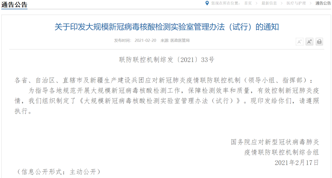 大规模新冠病毒核酸检测实验室管理办法 (试行) 第一条 为规范大规模新冠病毒核酸检测工作,保障检测效率和质量,有效控制疫情,根据《传染病防治法》《突发公共卫生事件应急条例》《医疗机构管理条例》《病原微生物实验室生物安全管理条例》《医疗机构临床实验室管理办法》等法律法规规定,制定本办法。第二条 本办法所称大规模新冠病毒核酸检测,是指辖区内局部或全部人群需开展新冠病毒核酸检测,检测量超过辖区内单体医疗卫生机构日常最大检测能力,需调动辖区内更多或辖区外检测力量,共同完成的核酸检测工作。第三条 开展大规模新冠病毒核酸检测的实验室(以下简称大规模检测实验室),包括具备新冠病毒核酸检测资质的医疗机构实验室(含医学检验实验室,下同)和疾控机构实验室。第四条 根据交通条件、人口及医疗卫生机构资源分布等因素,对设区的地市级以上城市及县域内开展大规模检测的实验室进行分类管理。(一)取得《医疗机构执业许可证》的医疗机构,或取得《事业单位法人证书》的疾控机构;(二)医疗机构实验室应当符合《医疗机构临床基因扩增检验实验室管理办法》的要求;(三)按照规定规范开展室内质控,并参加省级及以上卫生健康行政部门委托临床检验中心或其他机构组织的实验室室间质评,且最近两次质评结果合格;(四)具备经过卫生健康行政部门审核备案的生物安全二级或以上实验室条件;(六)省级卫生健康行政部门根据检测时效要求规定的其他条件。第六条 承担设区的地市级以上城市大规模新冠病毒核酸检测的实验室,除具备第五条规定的条件外,原则上还应当具备每天检测至少5000管的能力。承担县域大规模新冠病毒核酸检测的实验室,除具备第五条规定的条件外,原则上还应当具备每天检测至少1000管的能力。县域内的最大检测能力不足时,可委托其他大规模检测实验室开展检测。 地方卫生健康行政部门可根据检测工作需要,对不具备大规模核酸检测能力的实验室统筹分派检测任务。 第七条 按照《进一步推进新冠病毒核酸检测能力建设工作方案》建设的公共检测实验室和城市检测基地,应当承担大规模新冠病毒核酸检测任务。第八条 接受卫生健康行政部门调度前往支援的大规模检测实验室应当符合本办法第五条的规定。受援地应当为实验室开展工作提供必要的交通、食宿、场地、医疗废物收集和处置等条件,保障检测及时顺利安全开展。第九条 拟承担大规模新冠病毒核酸检测任务的实验室应当向省级卫生健康行政部门提出申请,按照规定的条件提供书面材料,并保证材料真实、准确、可靠。主要包括实验室场地、人员、仪器设备、检测能力、室内质控记录、室间质评结果等。第十条 省级卫生健康行政部门收到材料后,应当组织相关专业技术人员对材料进行审核,必要时进行现场查验。对符合条件的,应当在临床基因扩增检验实验室技术审核合格的证明文件中,加注“大规模新冠病毒核酸检测”;或通过证明文件、文书等方式标明该实验室具备大规模新冠病毒核酸检测能力。同时,在“全国新冠病毒核酸检测信息平台”中予以标识,供辖区内开展大规模新冠病毒核酸检测时参考使用。第十一条 开展大规模新冠病毒核酸检测时,可通过临时增加人员、设备等快速提高检测能力。拟承担检测任务的实验室,应当按照前款规定向省级卫生健康行政部门提出审核申请。审核通过的,在临床基因扩增检验实验室技术审核合格的证明文件中,加注“大规模新冠病毒核酸检测”;或通过证明文件、文书等方式标明该实验室具备大规模新冠病毒核酸检测能力,并标明有效期。第十二条 大规模检测实验室应当建立实验室质量管理体系和应急管理体系,制订工作预案,加强物资储备,强化人员技术培训,提高应急反应能力,确保随时开展工作。第十三条 大规模检测实验室应当根据自身检测能力接收新冠病毒核酸样本,避免样本数量明显超出检验能力导至的样本积压、样本失效、检测结果反馈迟缓等问题。第十四条 大规模检测实验室从事检验工作的人员应当是按照规定接受技术培训并考核合格,持有《临床基因扩增检验技术人员上岗证》的卫生技术人员。签发核酸检测报告的人员还应当同时具备相应资质。第十五条 大规模检测实验室应当在规定的时间内出具核酸检测结果,出具的核酸检测结果应当真实、准确、客观、公正。第十六条 各地决定开展大规模新冠病毒核酸检测后,应当根据交通条件、检测能力等,从通过审核的大规模检测实验室中遴选相关机构,签订委托协议,明确检测量、完成时限、检测费用等,并约定其他有关事项。第十七条 接到检测任务后,大规模检测实验室应当立即激活应急管理体系,确保在短时间内人员到位、设备到位、物资到位,样本送达后即刻开展检测。第十八条 大规模检测实验室应当按照有关规定,每批次检测时,随机进行弱阳性和阴性室内质控,并定期参加国家或省级组织的室间质评。第十九条 鼓励大规模检测实验室在每个分区的核心工作区域安装摄像设备,安装位置能清楚记录检测的关键流程、关键部位和操作,实时录制加样、抽取、扩增和报告等关键环节全过程。影像资料至少保存一个月。第二十条 在开展大规模新冠病毒核酸检测期间,卫生健康行政部门应当向大规模检测实
