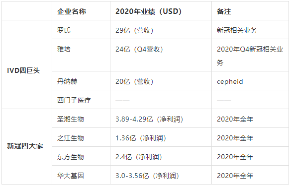 IVD全球四巨头 此前,我们一直关注的IVD四巨头,在过去的一年究竟表现如何呢?从2020年已公布的财报来看,全球IVD四巨头排名不变:罗氏第一,雅培第二,丹纳赫第三,西门子医疗第四。 今天主要关注四巨头的新冠业务,看看在这次新冠全球大流行中,他们的具体表现。 罗氏:诊断业务扛鼎了集团的增长重任。中国常规诊断业务受损严重,营收21亿美元,同比-11%。2020年,罗氏诊断各类新冠检测相关的营收达到29亿美元。 雅培:分子诊断和快速诊断两项业务获得超过100%的翻倍增长,带动了诊断业务增幅超过40%的耀眼成绩,是四巨头中诊断业务增长最快的企业。仅2020Q4,雅培全球COVID-19检测相关销售额为24亿美元。其中雅培的BinaxNOW、Panbio和ID NOW快速检测平台的总销售额达到19亿美元。 丹纳赫:排名第三,增速第二。诊断业务在四家中占比最高(37%),对整体业绩高速增长(+24.5%)起到了拉动作用。在2021年JMP上,丹纳赫首席执行官Rainer Blair表示丹纳赫在分子诊断领域重点关注Cepheid,其在2020年带来了大约20亿美元的收入。 西门子医疗:唯一下滑(-5%),主要受到疫情导至的常规产品销售不佳所累。中国市场增长3%,是为数不多的保持增长的目标区域。(统计时间为2019年10月1日至2020年9月30日)西门子医疗可提供的COVID-19检测产品似乎在数量上不占优势,成熟IVD产品仅包括FTD SARS-CoV-2检测试剂盒。 新冠国内4大家 据医疗器械技术评审中心数据,截至2021年2月10日,已批准56个新型冠状病毒检测试剂盒上市;虽然获批的产品多,但是把市场做好的企业并不多。据公开数据显示国内公司圣湘生物、之江生物、东方生物、华大基因的新冠检测业务揽下前4。 圣湘生物:1月18日,预增公告显示,2020年年度实现归属母公司所有者的净利润与上年同期相比,将增加251,678万元至276,678万元,同比增加6,375%到7,008%。2020年公司全年仪器累计发货6,122台。(以上为含新冠在内所有业绩)。 之江生物:1月28日,预增公告显示,2020年年度实现归属母公司所有者的净利润与上年同期相比,将增加87,849.96万元左右,同比增加1,705.10%左右。(以上为含新冠在内所有业绩)。 东方生物:1月6日,预增公告显示,2020年年度实现归属母公司所有者的净利润155,597.21万元,与上年同期相比,将增加147,386.69万元,同比增加1,795.10%左右。(以上为含新冠在内所有业绩)。 华大基因:1月27日,预增公告显示,2020年年度实现归属上市公司股东的净利润为200,000万-230,000万元,比上年同期变动623.77%-732.34%。海外业务收入实现快速增长,在整体业务中占比首次超过60%。(以上为含新冠在内所有业绩)。 IVD四巨头VS新冠四大家 |