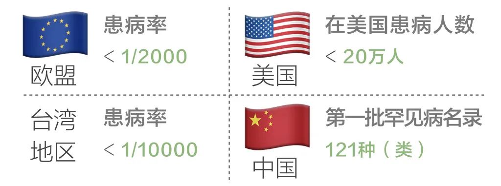 上部 全球视角 01 何为罕见病? “罕见病”一词译自英语rare disease。在全球权威的生物医学数据库PubMed中,rare disease一词最早出现在1867年。 ▲ 向上滑动阅读更多 第一篇以“rare disease”为题的论文 描述一个无从确诊也无法治疗的罕见骨病案例 与“常见病”相对,“罕见病”指患病率相对较低的一类疾病。 欧盟地区定义“罕见病”的标准是患病率<1/2000,台湾地区的标准是<1/10000。另一些国家则根据全国患者的数量来界定,比如在日本,患者<5万人的疾病被认为是“罕见病”。 各国或地区定义“罕见病”的标准不同 图 | 豌豆Sir 作为最早提出“罕见病”概念的国家,美国在1983年颁布的《孤儿药法案》中提出双重定义: