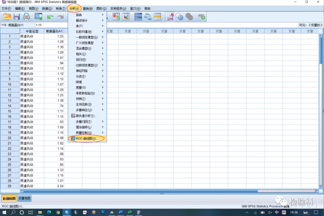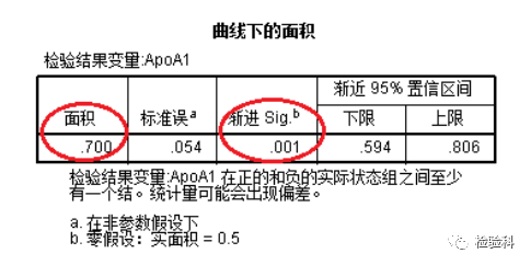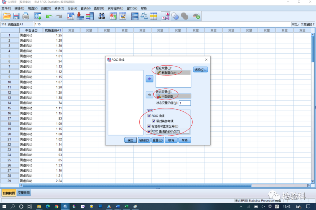 作者:张鹏 李琦 单位:中国中医科学院西苑医院检验科 受试者工作特征曲线(receiver operating characteristic curve)简称ROC曲线,又称感受性曲线(sensitivity curve),得此名的原因在于曲线上各点反映着相同的感受性,它们都是对同一信号刺激的反应,只不过是在几种不同的判定标准下所得的结果而已。 ROC曲线是由二战中的电子工程师和雷达工程师发明的,用来侦测战场上的敌军载具(飞机、船舰),也就是信号检测理论,二战后被引入统计领域,尤其广泛应用于医学统计中,用来做疾病诊断方法的比较。该曲线以假阳性率为横轴,真阳性率为纵轴,受试者在特定刺激条件下由于采用不同的判断标准得出的不同结果画出的曲线。 ROC曲线上各点反映的都是相同的感受性,通过对疾病组和参照组的测定结果进行分析,确定测定值的上下限、组距以及截断点,按选择的组距间隔列出累积频数分布表,并分别计算出所有截断点的真阳性率(灵敏度)、特异性和假阳性率(1-特异性),作图绘成ROC曲线。灵敏度(sensitivity),即敏感度,是指筛检方法能将实际有病的人正确地判定为患者的比例。特异度(specificity),是指筛检方法能将实际无病的人正确地判定为非患者的比例。 一般来说,对于两种诊断方法可以有成组比较法和配对比较法,成组比较法是两种诊断方法作用于不同受试者,配对比较法则是针对于同一受试者接受两种不同的诊断方法。ROC曲线适用于二分类别的反映效果或结果的变量。 (1)曲线下面积(AUC) AUC的值来评价诊断效果,其在1.0和0.5之间。当AUC>0.5时,AUC越接近于1,说明诊断效果越好:AUC在 0.5~0.7时,准确性较低;在0.7~0.9时,有一定准确性;AUC在0.9以上时,准确性较高。AUC=0.5时,说明诊断方法完全不起作用,无诊断价值。AUC<0.5不符合真实情况,在实际中极少出现。 (2)约登指数、灵敏度和特异度 约登指数(Youden Index),也称正确指数,是在假定假阴性(漏诊率)和假阳性(误诊率)的危害性有同等意义时常用的方法,其反映了真正的患者与非患者的总能力。约登指数是灵敏度与特异度的和减去1,约登指数越大说明真实性越大。同时,约登指数最大值对应的检验变量值是该方法的诊断临界值。 (1)打开SPSS 软件,输入数据,选择分析—ROC曲线 (2)选取检验指标载脂蛋白A1放入检验变量中,将中医证型放入状态变量中,将痰浊上扰证型赋值为1,阴虚风动证型赋值为0,输出项勾选ROC曲线、带对角参考线、标准误差和置信区间以及ROC曲线的坐标点。 (3)点击确定,得到分析结果。 (4)结果分析