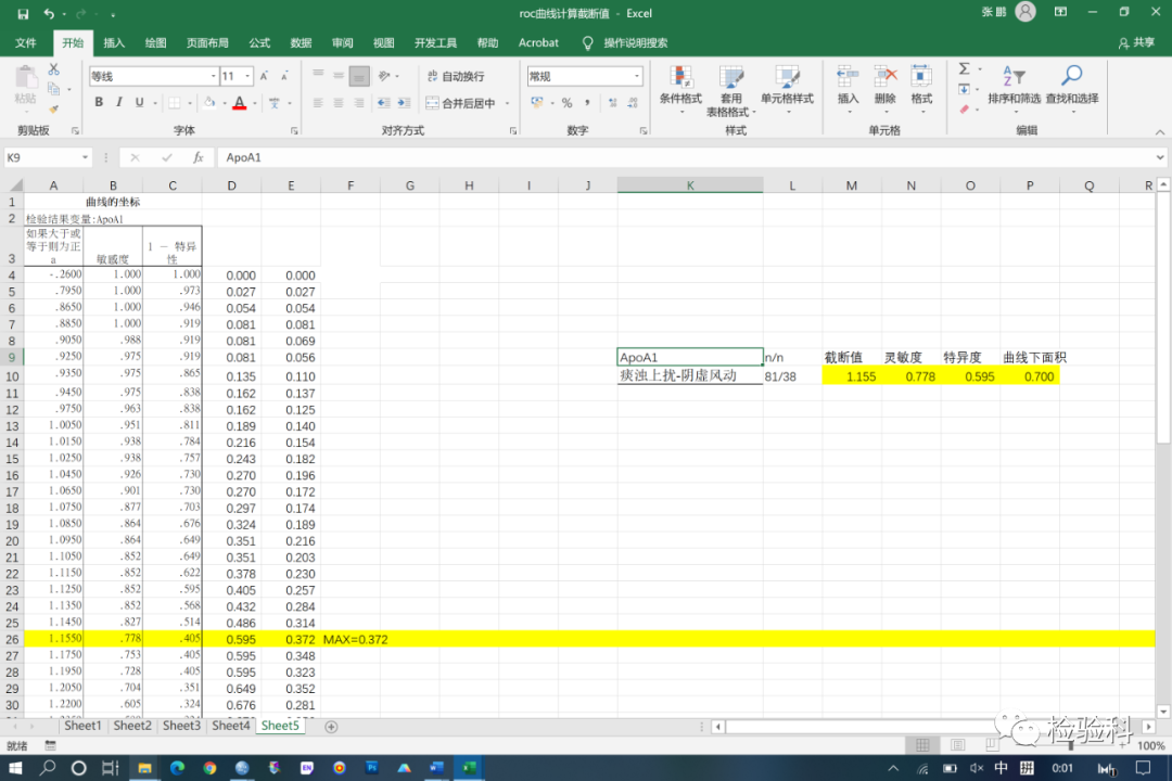 将分析结果中的“曲线的坐标”表复制到Excel中,计算“约登指数”,约登指数=敏感度+特异度-1。载脂蛋白A1的约登指数最大值是0.372,对应载脂蛋白A1是1.155 g/L,可以作为鉴别两中医证型的临界值。 |