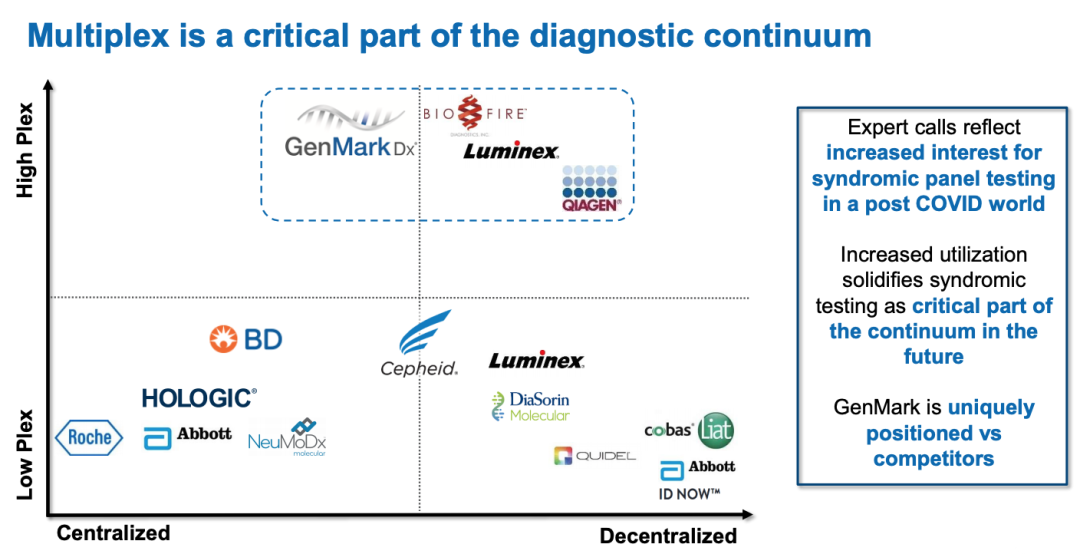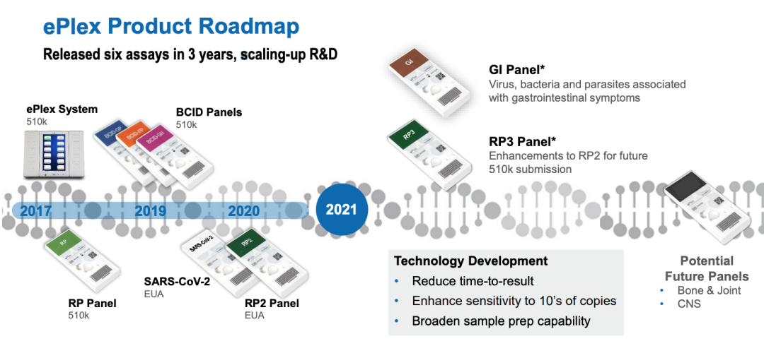 从声明中可以看出,ePlex平台一定是GenMark的“拿手好戏”。 据悉,该公司专有的eSensor检测技术和ePlex、eSensorXT-8系统旨在通过易于使用的工作站和独立的一次性检测盒,以支持广泛的分子诊断样品进行检测。 ▲GenMark主打产品ePlex系统 其中,主打产品ePlex系统可提供快速且可行的结果,使临床医生可以确定患者感染的原因,从而提供有效的治疗方法。 去年3月,ePlex SARS-CoV-2检测系统获得FDA紧急使用授权(EUA)。这一检测系统可在2小时内提供检测结果,每8小时的处理量达到96个检测样品,大大加快了实验室诊断的速度。 在ePlex系统的推动之下,2020年,GenMark的收入增长了95%,达到1.71亿美元。GenMark预计,2021年的销售额可能会增长10%至15%。 ▲GenMark2020营收数据 另一方面,能被大哥看上的小弟一定是“积极上进”的。2017年以来,GenMark持续增加研发投入,3年发布了6种检测方法,不断丰富ePlex产品线,蓄势待发。 ▲ePlex产品路线图 罗氏诊断公司首席执行官Thomas Schinecker表示:“收购GenMark Diagnostics将扩大我们的分子诊断产品组合,以包括可以为患者及其医疗保健提供者快速提供救生信息的解决方案,以抗击传染病。” “他们在综合症小组测试中久经考验的专业知识可提供更快的针对性治疗干预,从而改善患者的预后并减少住院时间,并将有助于罗氏致力于帮助控制传染病和抗生素耐药性的承诺。对于医院及其患者来说,快速识别血流感染和检测抗菌素耐药基因比以往任何时候都更为重要。” “作为罗氏公司的一部分,我们可以加快使命,实现对传染病的快速诊断,从而改善患者的预后。连同罗氏的诊断医疗保健解决方案,我们将能够为全球客户提供全套的分子诊断解决方案。” GenMark Diagnostics的首席执行官Scott Mendel说。“我们很高兴成为罗氏公司的一份子,这使GenMark和我们的客户前进的正确道路充满信心。” 总结来看,收购之后,双方共赢: