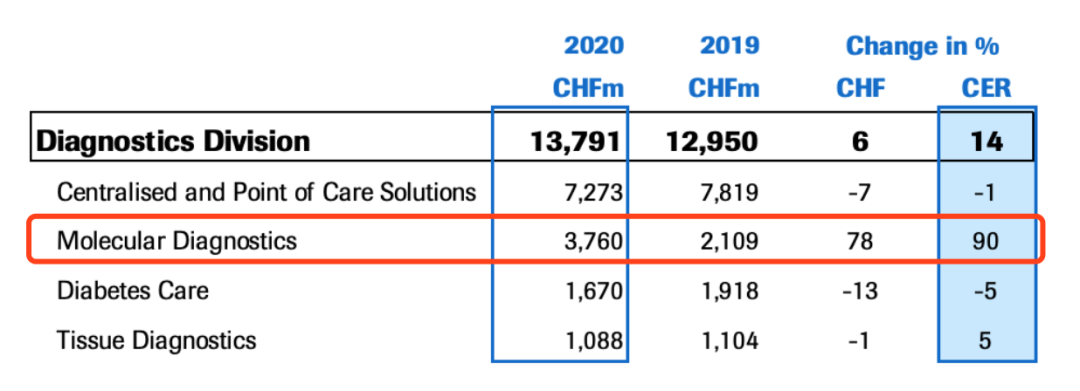 ▲GenMark的竞争地图 疫情之下,罗氏是全球分子诊断的最大赢家。 ▲2020年罗氏诊断四大业务营收数据 罗氏年报显示,受到cobas SARS-CoV-2 PCR检测的强劲驱动,2020年,罗氏分子诊断业务营收37.6亿瑞郎(约40.5亿美元),同比+78%,成为罗氏诊断第二大业务单元,成绩不可谓不亮眼。 而全球IVD领域排名第二的雅培,2020年分子诊断业务营收14.38亿美元,虽然大涨+224.9%,但与罗氏仍有超过2倍的差距。 再看看全球排名第三的丹纳赫,在2021年JMP上,丹纳赫首席执行官Rainer Blair表示丹纳赫旗下分子诊断企业Cepheid,其在2020年带来了大约20亿美元的收入,虽超越雅培,仍大幅度落后于罗氏。 所以说,罗氏是分子诊断领域内当之无愧的龙头大哥。 如今,行业新锐牵手业界传奇,说不定会擦出一场别样的火花! 在今后IVD行业的发展中,新冠将成为绕不过去的关键词,从近期行业并购来看: