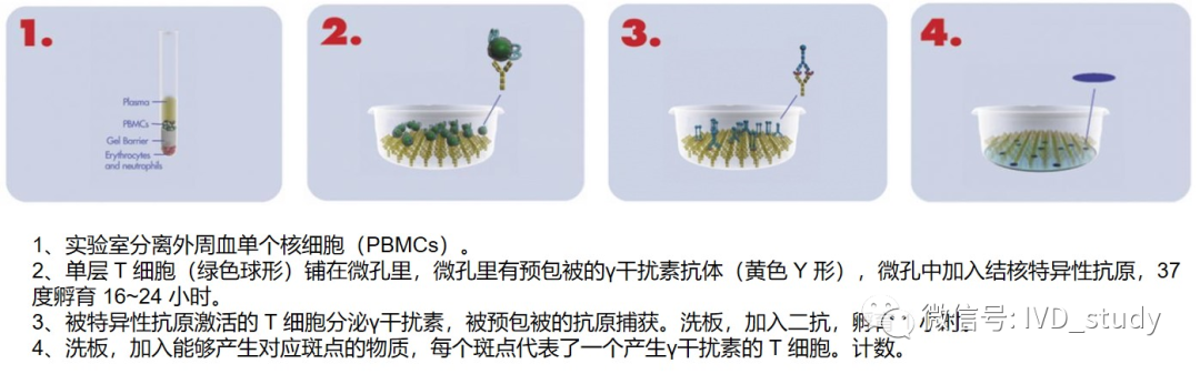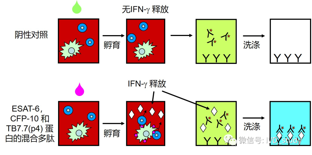 一是采用酶联免疫吸附实验(ELISA)方法检测全血中致敏T细胞再次受到结核分枝杆菌特异性抗原刺激后释放的γ-干扰素水平,如QIAGEN的QuantiFERON TB Gold™实验。QuantiFERON TB Gold™实验原理图注:ESAT-6(早期分泌性抗原靶6)和CFP10(结核分枝杆菌特异性抗原培养滤液蛋白10)诱导T细胞产生大量干扰素γ,引发皮肤产生迟发型超敏反应。 二是采用酶联免疫斑点技术方法测定在结核分枝杆菌特异性抗原刺激下,外周血单个核细胞中能够释放γ-干扰素的效应T细胞数量,如T-SPOTTB (ELISPOT)技术。