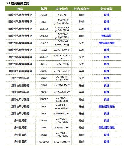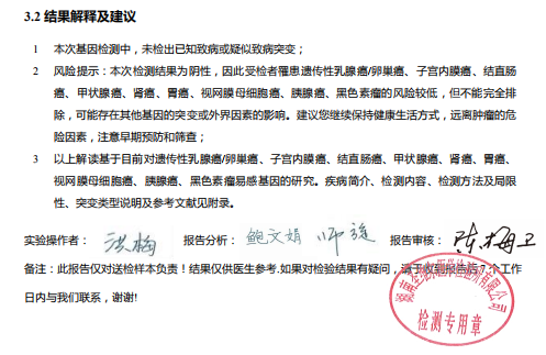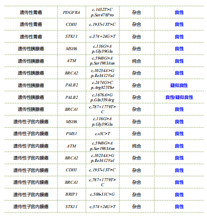 2019年12月17日取患者2ml EDTA抗凝血进行“遗传性肿瘤易感基因全套检测”,平均测序深度为576X,检测结果提示无遗传性肿瘤相关基因的致病性突变,遗传风险低。