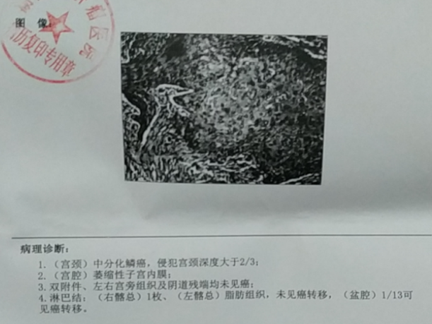 2017年(49岁)12月确诊宫颈癌,行宫颈癌根治术,术后病理示,(宫颈)中分化鳞癌,盆腔淋巴结1/13可见癌转移,术后辅助化疗6个周期。