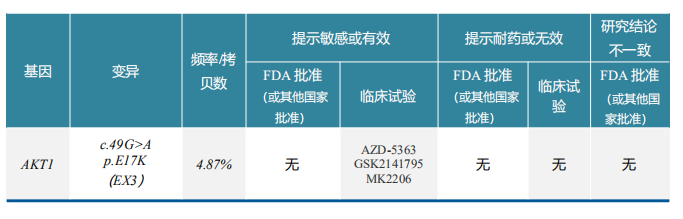 2019年11月26日取2017年底宫颈肿瘤手术标本进行“实体瘤50基因检测”。基因检测结果显示存在AKT1基因3号外显子突变(突变频率4.87%),提示患者宫颈肿瘤组织分子生物学特征与肺部肿瘤不一致,非同一来源。