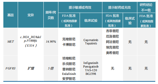 2019年9月6日出具基因检测结果显示:MET基因14号外显子突变(突变频率14.9%)及FGFR3基因5倍扩增。