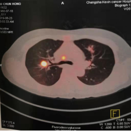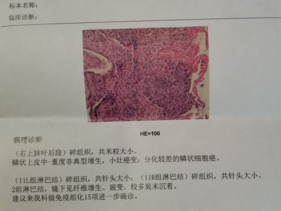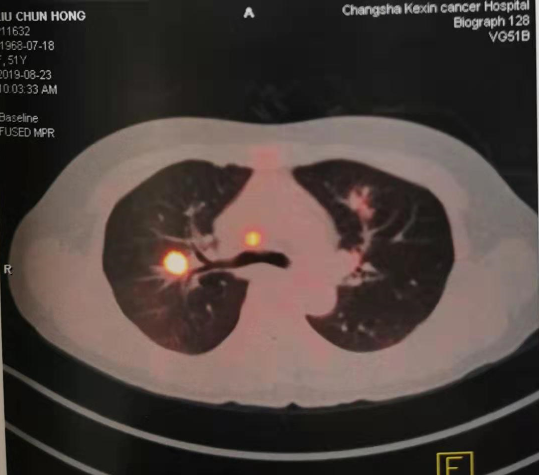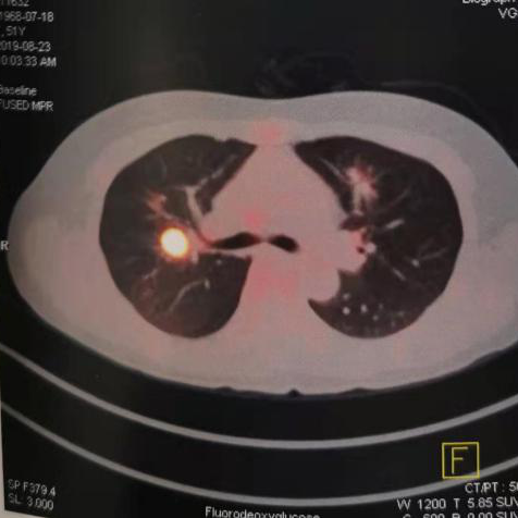 2019年8月(51岁),来院检测CT示肺部阴影,PET-CT示高代谢病灶。行超声支纤镜活检示:低分化鳞癌。
