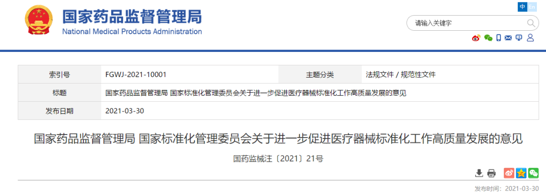 各省、自治区、直辖市和新疆生产建设兵团市场监管局(厅、委)、药监局,各医疗器械领域全国专业标准化技术委员会、分技术委员会,各医疗器械标准化技术归口单位,各有关单位: 医疗器械安全与人民群众身体健康和生命安全息息相关,是健康中国的重要组成部分。近年来,医疗器械科技和产业迅猛发展,医疗器械监管改革深入推进,创新、质量、效率持续提升,医疗器械标准化工作发挥了重要的基础保障作用。为贯彻十九届五中全会精神,落实党中央、国务院关于标准化工作改革决策部署,坚持科学化、法治化、国际化、现代化发展方向,以高标准夯实医疗器械监管和产业高质量发展基础,更好发挥标准在制械大国向制械强国跨越中的支撑和引领作用,现就进一步加强医疗器械标准化工作,提出以下意见:1.完善标准体系结构。研究制定标准体系建设的通用原则和基本要求,合理规划标准体系布局,围绕医疗器械监管和产业发展重大部署,科学编制标准规划。落实强制性国家标准实施情况统计分析报告制度,全面开展强制性标准评估,持续优化医疗器械强制性标准,严格限定强制性标准制定范围,逐步将适用范围广、影响面大的强制性行业标准转化为强制性国家标准。优化推荐性标准,重点支持基础通用、与强制性国家标准配套、对产业有引领作用的推荐性国家标准制修订;鼓励新兴技术领域、监管急需的推荐性行业标准制修订。培育团体标准发展,鼓励社会团体围绕新技术、新业态,积极开展医疗器械领域团体标准制定工作。构建形成结构合理、层次清晰、协调配套,守底线保安全、追高线促发展的医疗器械标准体系。2.加强基础通用标准研制。完善医疗器械术语定义、标记标识、风险管理、质量管理、临床评价管理、可用性工程、统计技术、数字安全等覆盖医疗器械全生命周期的基础标准。加快制修订医用电气设备基本安全和基本性能、生物学评价等通用标准。3.加强有源医疗器械标准研制。加快推进医用机器人、人工智能、有源植入物、医用软件、5G+工业互联网、多技术融合等医疗器械新兴领域共性技术研究和标准制定工作。探索推动医疗器械关键核心零部件标准制定。完善医用呼吸及麻醉设备、消毒灭菌设备、口腔数字化设备、医用体循设备、放射治疗及核医学设备、医用超声设备、物理治疗设备、医用实验室设备、医用X射线诊断设备、医用激光设备、医用射频设备等领域高端医疗器械相关标准。4.加强无源医疗器械标准研制。加强新型生物医用材料标准研究,推动药械组合产品、增材制造、可降解类、组织工程类、重组胶原蛋白类、纳米类等新技术、新工艺、新材料标准的制修订工作。开展有害物质表征及毒理学评价方法研究及标准制定。建立临床前动物试验标准体系。深入开展无源植入物、医用敷料、生物防护器械、口腔器械、光学等新产品的标准化工作。5.加强体外诊断试剂标准研制。加快高风险传染性疾病诊断试剂及相关方法标准制定,开展新冠肺炎疫情防控相关体外诊断试剂标准研究。推进高通量测序等新型分子诊断技术、临床质谱技术、伴随诊断试剂、即时检验、溯源和参考测量系统等领域标准制修订工作。6.推进急需标准快速制定。落实深化标准化改革精神,对重大突发应急事件等确保公共卫生安全的监管急需标准,快速立项、快速制定、及时发布。对量大面广、影响力强、监管急需的重要强制性标准以及国内首创、国际领先的新技术、新产业相关标准,经专家论证,条件成熟的,进入标准制修订快速通道。7.优化标准制修订工作机制。全面梳理标准制修订各环节工作程序,围绕质量、效率优化工作机制,鼓励企业、科研院所、社会团体等各相关方积极参与标准制修订工作,引导行业领军企业在标准制修订工作中发挥更大作用。加强标准验证,广泛公开征集验证单位,扩大验证产品的覆盖面。强制性标准验证范围应当覆盖典型产品。探索设立医疗器械标准验证点。8.加快标准更新速度。对技术发展迅速的相关标准及时复审,确保标准的科学性、适用性、先进性。建立与国际标准快速联动的标准更新机制,探索国内标准与国际标准同步立项,缩短国际标准转化周期。加强国际标准的跟踪、比对和评估,在符合有关国际组织版权政策前提下,及时转化符合我国国情的国际标准,提升国内外标准一致性程度。9.落实企业在标准实施中的主体责任。进一步压实企业实施标准的主体责任,把标准作为生产、经营等环节风险控制的依据和手段,保证出厂产品符合强制性标准以及经注册或者备案的产品技术要求。鼓励企业制定高于国家标准和行业标准的产品技术要求,支持企业瞄准先进标杆企业实施技术改造,积极引导企业提升产品质量。探索建立产品执行标准自我公开和监督制度,形成企业承诺和社会监督并行的标准实施监督机制。宣传一批标准实施“标杆”企业。10.强化标准实施工作。各级医疗器械监管部门要将标准宣贯培训纳入年度培训计划,并将企业执行标准情况作为日常监督检查的重要内容,督促企业落实质量安全主体责任。强化检验、审评、审批、许可、检查、执法等过程中强制性标准实施机制,保障强制性标准严格执行。积极鼓励实施推荐性标准,促进规范性文件或者指导性文件积极引用推荐性标准,统一执