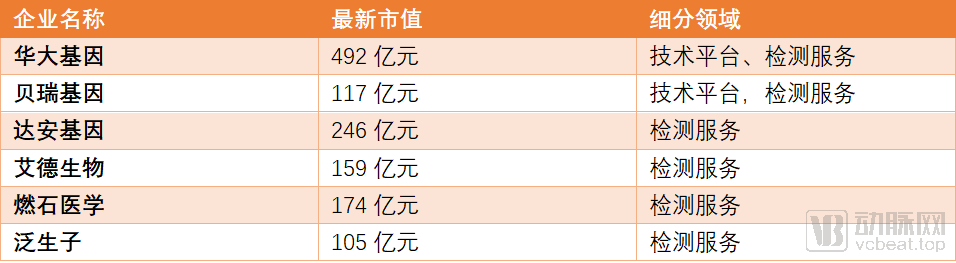 实际上,无论布局临床应用场景还是用机器替代人工,在对稳定性、精密性要求极高的基因检测行业,都是极大的挑战。对诺禾致源亦如是,但做到了,就是壁垒。 基因检测还是个好赛道吗? 诺禾致源上市后,国内基因检测的资本市场进一步拥挤。从上游平台到中下游应用、服务,从科研服务到优生优育、肿瘤诊疗,每个赛道都挤进了至少一家上市公司,贡献近1300亿元市值。如果以BBC Research统计的全球基因检测市场138亿美元市场规模计算,资本市场上的基因检测项目已经近乎饱和。
