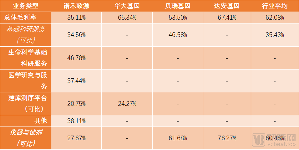 以2020年为例,华大基因、贝瑞基因、达安基因的毛利率分别为65.34%、52.5%、67.41%,行业平均毛利率62.08%,但诺禾致源仅35.11%。