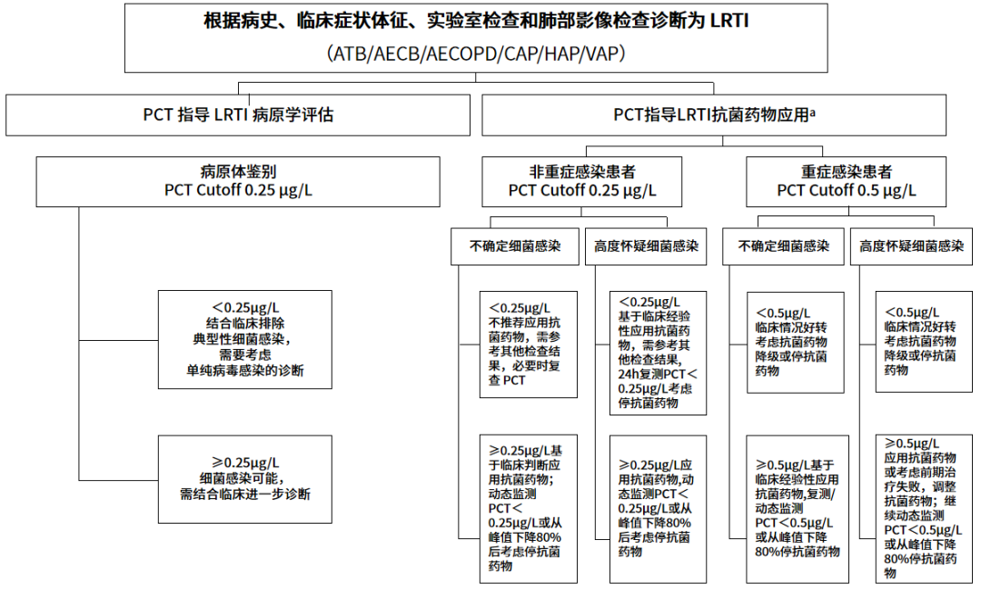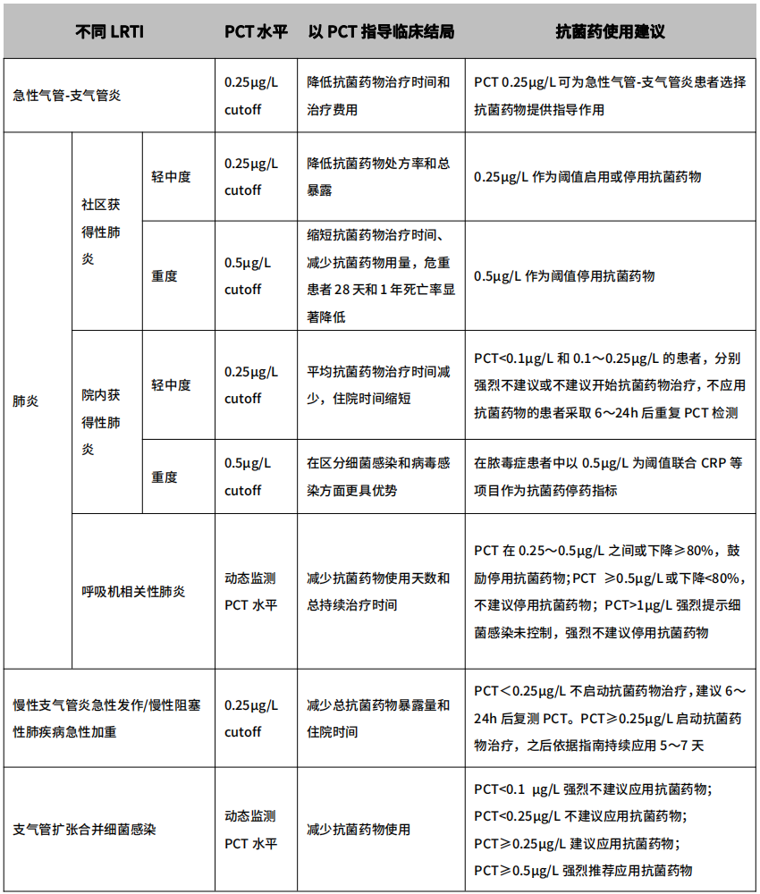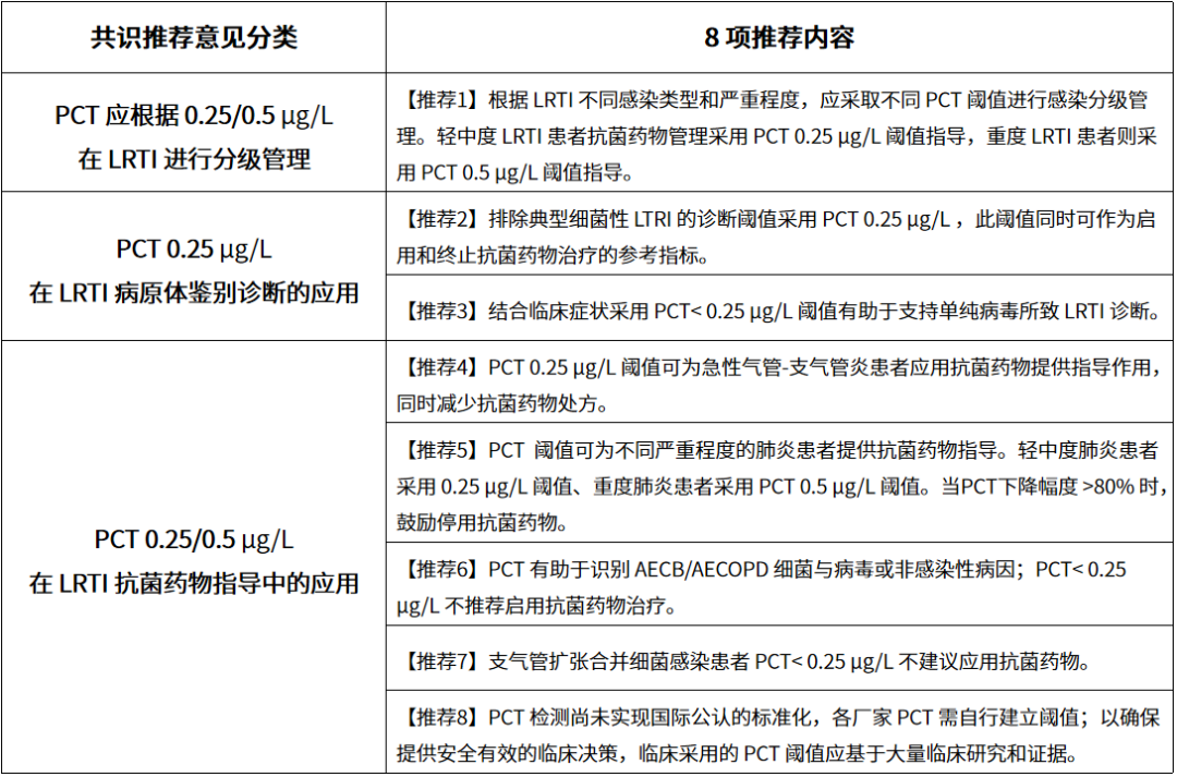 感染生物标志物降钙素原(PCT),有助于区分细菌性和非细菌性感染,帮助临床安全减少抗菌药物处方率,缩短抗感染治疗疗程,降低细菌耐药率。然而,此前 PCT 在下呼吸道感染(LRTI)的应用并无清晰的临床指导方案,2021 年 4 月 1 日在《中华急诊医学杂志》上发表的《降钙素原在成人下呼吸道感染性疾病分级管理中的应用专家共识》(以下简称《共识》)填补了这一空白。 共识着重强调了三个方面: 1、推荐将 PCT 0.25 μg/L 作为下呼吸道感染诊断阈值,推荐 PCT 0.25 / 0.5 μg/L 指导不同严重程度 LRTI 抗菌药物合理应用; 2、首次明确给出 PCT 在 LRTI 临床诊疗路径的指导性文件; 3、强调了 PCT 检测尚未实现国际标准化,检测平台选择上应注意结果溯源性。非 B·R·A·H·M·S PCT 产品需建立各自的参考区间和临床决定阈值。 第一,共识推荐将 PCT 0.25 μg/L 作为下呼吸道感染患者的诊断阈值,而 PCT 0.25 / 0.5 μg/L 可有效安全的指导不严重程度 LRTI 患者的抗菌药物治疗。 1)PCT 在 LRTI 病原体诊断中具有很好的鉴别价值(表 1) 表 1 PCT 在下呼吸道感染的鉴别诊断阈值和临床意义 以 0.25 μg/L 作为诊断阈值可帮助鉴别典型细菌性感染和病毒、非典型病原体所导至的 LRTI;而在病毒性 LRTI 患者鉴别诊断中,在 0.25 μg/L 阈值上 PCT 具有较高的细菌感染阴性预测值且检测方便快速,可在得到病毒核酸检测结果前用于发热门诊及急诊患者的筛查和快速分流;同时对于下呼吸道支原体、衣原体、军团菌、真菌、肺结核、寄生虫感染患者,PCT 0.25 μg/L cutoff 能够为临床提供诊断依据或给到相应的治疗提示。 2)PCT 0.25 μg/L / 0.5 μg/L 在不同类型 LRTI 分级管理中的应用(图 1) 图 1 不同 PCT 阈值指导成人 LRTI 中抗菌药物的应用 (点击查看大图) 第二,本《共识》首次为中国临床医生清晰制定了降钙素原在 LRTI 的诊疗路径。包含了就诊患者的 LRTI 病原学评估和指导 LRTI 抗菌药物应用两方面(图 3)。这一 PCT 诊疗路径为临床合理合规开具 PCT 检查单、安全有效的指导临床合理应用抗菌药物,明确了基本指导方针。 图 2:降钙素原 LRTI 推荐诊疗路径图 (点击查看大图) 依托 PCT 在 LRTI 的诊疗路径,《共识》总体纳入了 8 项推荐意见如下(图 3): 《共识》8 项推荐意见(图 3) (点击查看大图) 第三,PCT 在 LRTI 应用的检测需求