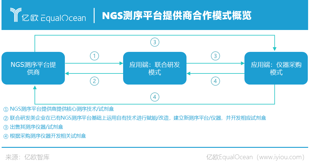 NGS测序平台:议价能力强大,企业围绕生长 由于NGS测序平台研发的技术壁垒较高,我国市场上仅有三家企业,NGS测序平台提供商在市场中便拥有较高的议价能力与话语权。下游NGS应用端的企业处于相对弱势地位,其与上游NGS测序平台的提供商主要有两种合作模式:联合研发模式与仪器采购模式。 联合研发模式主要为应用端企业在NGS测序平台提供商已有的测序平台上进行细节优化与改造,进而建立和自己业务线更加契合的测序平台和测序仪器(海外仪器在改造后可申请国产仪器注册批号)。仪器采购模式则为应用端企业直接购买NGS测序平台提供商的测序平台进行使用。 作为拥有核心测序技术的三家企业,Illumina、Thermo Fisher与华大智造都已和应用端的众多企业达成了基于联合研发模式或仪器采购模式的合作,共同构建了以测序平台供应商为核心的“企业环绕体系”,即各应用端以某一测序平台为中心环绕发展、进行仪器联合研发(内环)或采购(外环)并研发基于此平台的基因测序试剂盒。 在企业环绕体系中,内环多为注重IVD业务的企业。由于临床对基因测序的需求,企业需要能够获得NMPA医疗器械许可的仪器,然而大部分测序平台的仪器在早期并没有获得医疗器械证件。因此,这些企业曾投入大量研发资金,与测序平台提供商进行合作研发并申报医疗器械注册证件。 外环企业主要分为两种,一种为体量相对较小且研发资金有限的企业,由于资金受限,虽然对IVD模式有布局的打算,但合作研发成本过高,从而选择直接采购相关器材;另外一种企业则是拥有一定体量但战略倾向LDT的第三方实验室企业,这类企业的主要业务主要围绕自身实验室展开,大都选择选择多平台布局,减少风险。