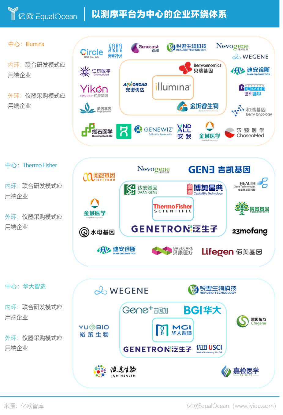 下游环绕:企业发展的受制于人与无从选择 目前,“企业环绕体系”在我国市场中相对稳定,但在这种环绕体系下,处于弱势的下游企业面临着许多的困难与风险。 Illumina:和我合作,你有钱吗? Illumina目前在NGS的市场份额上比对其他企业有相对优势,其周围所环绕的企业数量最多且总体量最大,是目前二代基因测序技术平台毋庸置疑的领先者。这主要由于Illumina的边合成边测序法技术成熟,拥有通量大、稳定性好、精准度高等优势,再加上布局NGS测序平台较早市场认知度较高,其在NGS测序平台老大的交椅上坐了多年。 然而,也正因如此,作为行业龙头的Illumina面对下游企业的态度曾十分强硬。“它(Illumina)想不卖给你,就不卖给你,想给你涨价,就给你涨价。”一名曾经从事基因测序的工作人员讲道。“疫情期间,因为没和他们(Illumina)谈好,试剂盒直接就给你断了,你说这么多台机器没有试剂盒,怎么办?”曾使用Illumina测序平台的实验室负责人也向亿欧EqualOcean的工作人员抱怨道。 其实早在2012年,类似的事情就已经发生,当时llumina占据测序仪市场约70%的份额,市场份额远超当时的竞争对手Roche与Thermo Fisher,在业内拥有绝对的话语权。由于中下游公司因为无法摆脱对其的依赖,Illumina曾在2012年后多次涨价。华大基因也曾是Illumina的重要合作伙伴之一,但由于无法接受Illumina的强硬态度与高价格,其在2013年耗资7.2亿元收购美国测序仪生产商Complete Genomics(CG),开始布局上游设备研发。 华大智造:性价比高,相信我! 华大基因自2013年收购了CG之后便开始组建基因测序仪研发团队。2016年,华大智造正式成立,至今已完成B轮融资。然而,由于华大智造起步相对较晚,且技术沉淀目前还不能与Illumina抗衡。以华大智造为NGS平台为中心进行开发和应用的企业相对较少,尤其在内环中,除泛生子外,其他三家企业皆为“华大系”,即华大基因及其投资企业。 华大智造的NGS测序平台的高性价比有目共睹,但其下游企业对其的产品的信任度还有待提升。“我们不排斥华大智造,但目前我们还是想和一个在市场上耕耘更久、平台更加可靠的企业合作。”一家使用Illumina测序平台公司的高管讲道。“华大智造现在条件和我们讲得很好,但是谁知道他一旦拿到了一定的市场份额后,会不会也像Illumina一样呢?”另一家NGS应用端企业的高管也对使用华大智造有所担心。“目前我们主要把华大的平台用在科研上,华大的市场认知度还没建立起来。”一位使用多平台的基因检测实验室负责人讲到。 Thermo Fisher:NGS测序平台?我好像有这条业务线。 在能够提供NGS测序平台的三家企业中,赛默飞世尔是体量最大的企业。其全球雇员已超过7.5万人,年收入255亿美元,市值超过1379.1亿美元,业务包含生命科学、实验室产品和服务、专业诊断、分析仪器四大板块。NGS测序平台提供商也仅是其诸多标签中的一个,再加上半导体测序法的通量对比另外两种方法较小,Thermo Fisher在NGS上的存在感不强。 亿欧EqualOcean的工作人员和许多非Thermo Fisher环绕体系的企业沟通时得知,体系太大而导至的业务推进困难与测序技术不符合公司需求是应用端企业难以与Thermo Fisher合作的主要原因。“之前考虑过与Thermo合作,但它们业务推动起来太慢了,Illumina合同都递过来了它们还在走程序。”一家使用illumina测序平台的企业高管讲道。“Thermo的仪器不太符合我们的需求。”一家使用华大智造测序平台的实验室负责人提及Thermo Fisher 时感叹道。“Thermo这家企业太大了,NGS市场他们应该也不在乎吧?”一家测序服务商的实验室工作人员笑着说道。 一家企业拥有较高的产品质量与技术沉淀,但价格高昂且态度强硬;一家企业主打产品性价比,但难以处理企业的信赖问题;还有一家企业佛系发展,产品又有相对限制。NGS测序平台的使用者们该选择哪家呢? 本文部分内容节选自亿欧智库《2021年中国基因检测行业研究报告:技术篇》 |