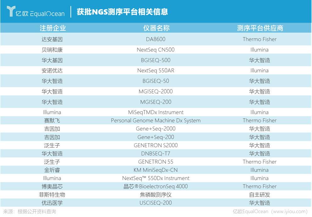 2020年6月,燃石医学与泛生子先后于美国纳斯达克上市,打破了贝瑞基因与华大基因于港交所上市后约3年无NGS相关服务企业上市的“沉默期”。自此之后,多家基于NGS技术的基因测序服务企业于市场中发展活跃:2021年2月,贝康医疗在港交所上市,世和基因、诺唯赞、吉凯基因与臻和科技等企业也多次传出上市计划。 然而,在所有NGS基因测序企业的背后只有三个名字:Illumina、Thermo Fisher与华大智造。 我国自2014年重新启动基因测序临床应用之后,NGS相关测序平台注册量攀升迅速。目前,我国已有获批NGS测序平台从2014年1种达到了至今的18种。这些测序平台虽然注册企业不尽相同,但其采用的核心技术主要为三种:Illumina的边合成边测序法、Thermo Fisher的半导体测序法与华大智造的联合探针锚定聚合测序法(焦磷酸测序法由于通量过低,市场上少有使用)。