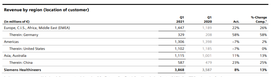 ▲西门子医疗2021财年Q1区域营收