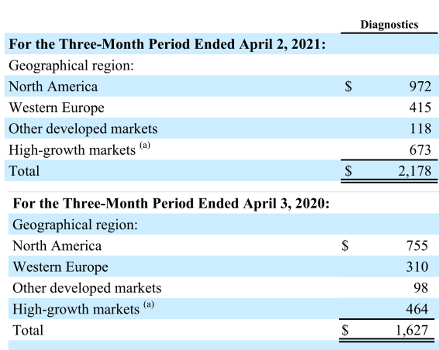 ▲丹纳赫2021财年Q1诊断业务区域营收