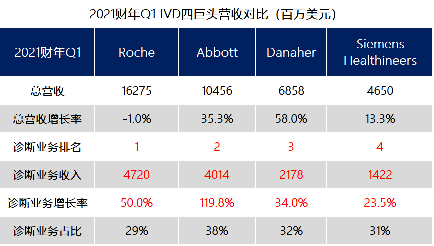 四巨头Q1诊断业务排名依旧,罗氏第一,雅培第二,丹纳赫第三,西门子医疗第四。