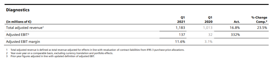 ▲西门子医疗2021财年Q1诊断业务营收