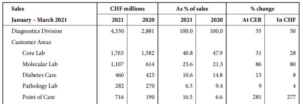 得益于COVID-19检测的强劲需求,诊断业务Q1实现出色增长,营收11.83亿欧元(约14.22亿美元),同比+23.5%