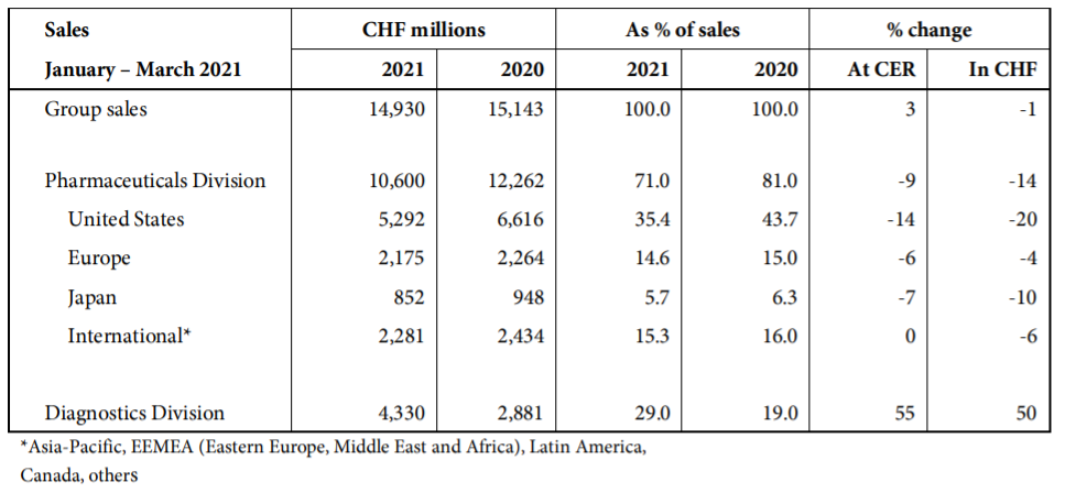 罗氏在2021年Q1的整体营收为149.3亿瑞士法郎(约162.75亿美元),同比-1%(按固定汇率同比+3%)。其中,