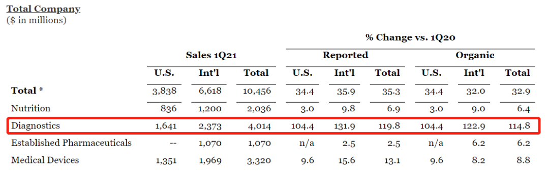 2021年Q1,雅培营收104.56亿美元,同比+35.3%,有机同比+32.9%,开局顺利。