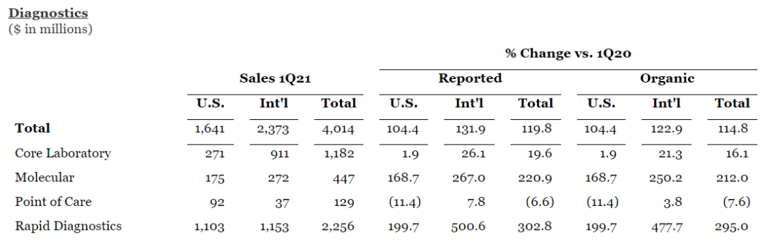 在全球对COVID-19诊断产品组合的需求推动下,雅培诊断业务Q1实现了亮眼的三位数增长,同比+119.8%,营收达40.14亿美元。其中,