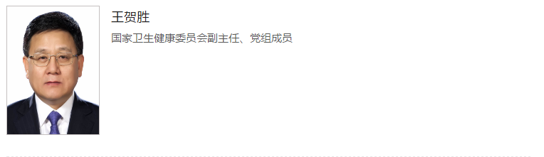 王贺胜,男,1961年6月出生,河北清苑人,1984年6月入党,1984年8月参加工作,研究生学历,法学博士,教授。1984年8月起历任天津医学院卫生系团总支书记、天津医学院八年制学生办公室团总支书记、天津医学院团委副书记、团委书记、天津医科大学团委书记;1997年3月任天津医科大学党委副书记;2002年4月任天津市教育委员会副主任;2002年10月任天津市委教卫工委副书记、市教育委员会副主任;2005年8月任天津美术学院党委书记;2008年5月任天津市卫生局党委书记;2010年5月任天津市卫生局党委书记、局长;2014年6月任天津市卫生和计划生育委员会党委书记、主任;2014年12月任天津市委宣传部常务副部长;2015年7月任天津市委常委、宣传部部长;2016年8月任国家卫生和计划生育委员会副主任、党组成员;2016年10月任国家卫生和计划生育委员会副主任、党组成员、国务院医改办主任;2018年3月任国家卫生健康委员会副主任、党组成员。负责医药卫生体制改革、医政医管、宣传等方面工作。分管体制改革司、医政医管局、宣传司,中日友好医院、中国健康教育中心、中国人口宣传教育中心、卫生发展研究中心、医疗管理服务指导中心、国家医学考试中心、医院管理研究所、国家心血管病中心、国家癌症中心、人口文化发展中心、健康报社、中国人口报社、人民卫生出版社有限公司、中国人口出版社(有限责任公司)。联系中国人口文化促进会。国家疾病预防控制局成立,正式拉开了疾病预防控制系统改革的序幕。下一步,各省市疾病预防控制局应当将会相继成立,疾病预防控制系统改革开始启动!来源:人力资源和社会保障部 | 供稿:Weber |