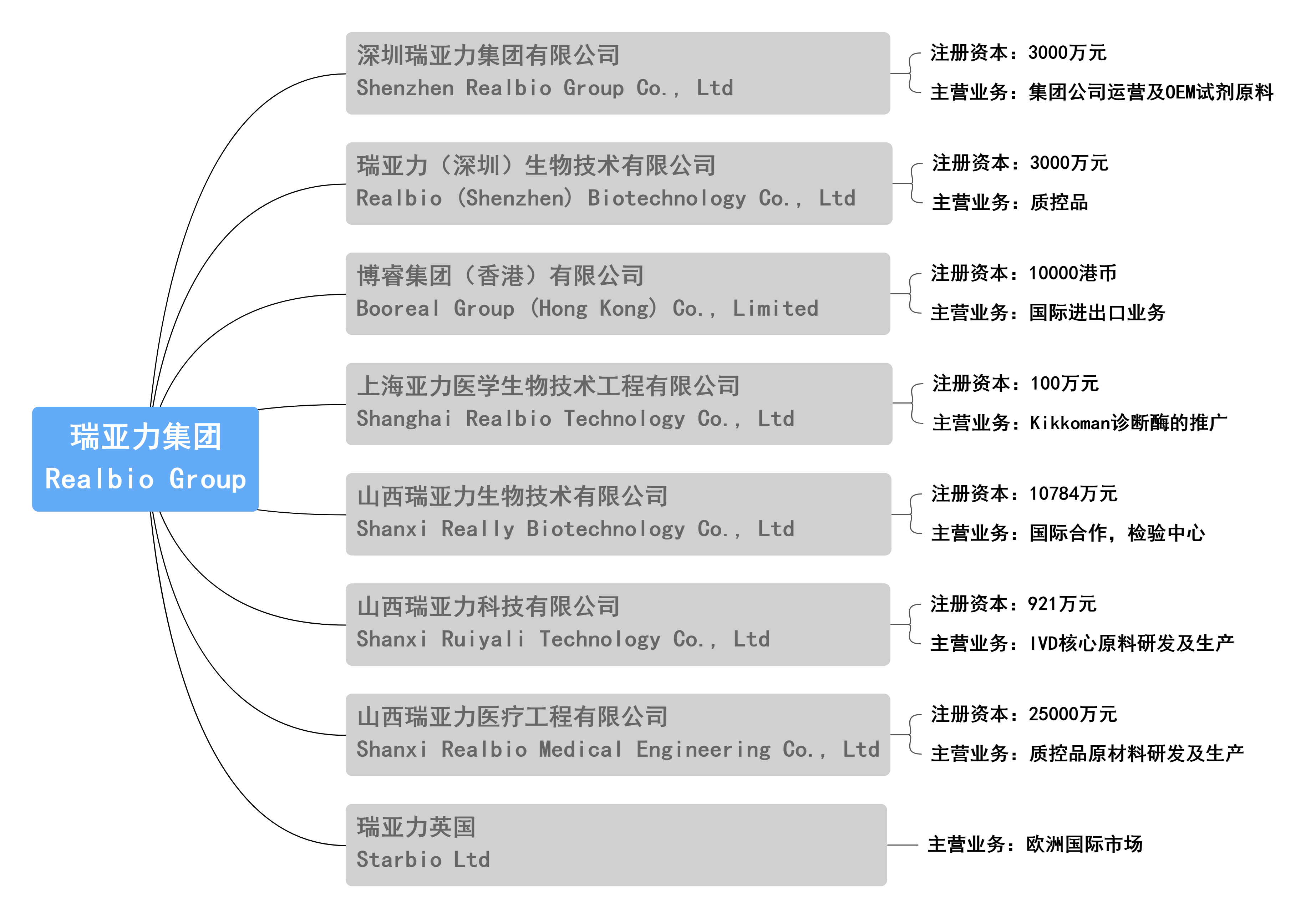 瑞亚力始创于2014年,是由中科院深圳先进技术研究院技术团队创立,由山西政府招商引资重点引入的高新技术项目,集生物制品、IVD原材料、医疗器械、诊断试剂、标准质控、科研技术服务、医学转化中心为一体的创新科技型公司。公司总部位于深圳,在英国、香港、上海、山西等地设有分支机构。目前有深圳瑞亚力集团有限公司、瑞亚力(深圳)生物技术有限公司、博睿集团(香港)有限公司、上海亚力医学生物技术工程有限公司、山西瑞亚力科技有限公司、山西瑞亚力生物技术有限公司、山西瑞亚力医疗工程有限公司、瑞亚力英国。